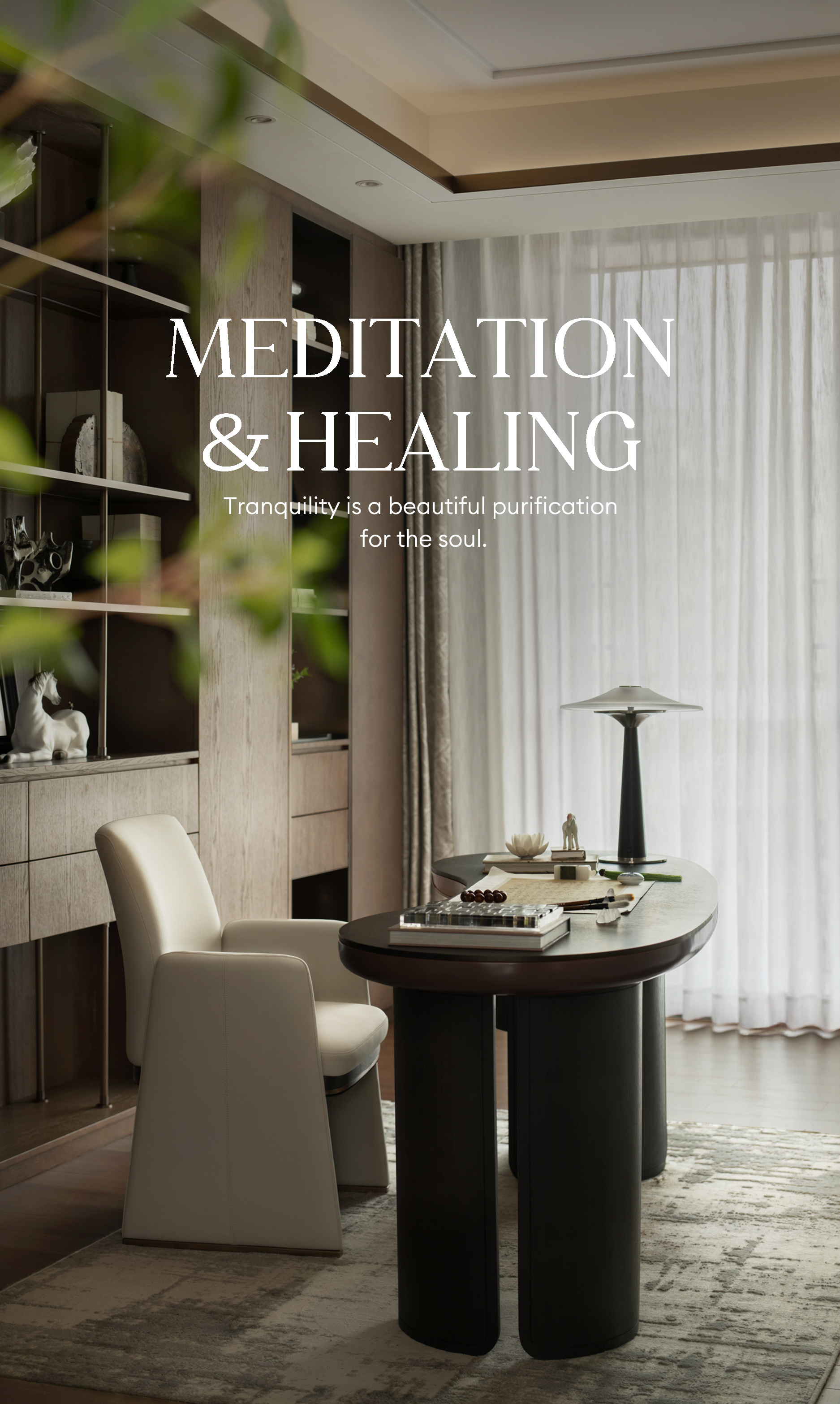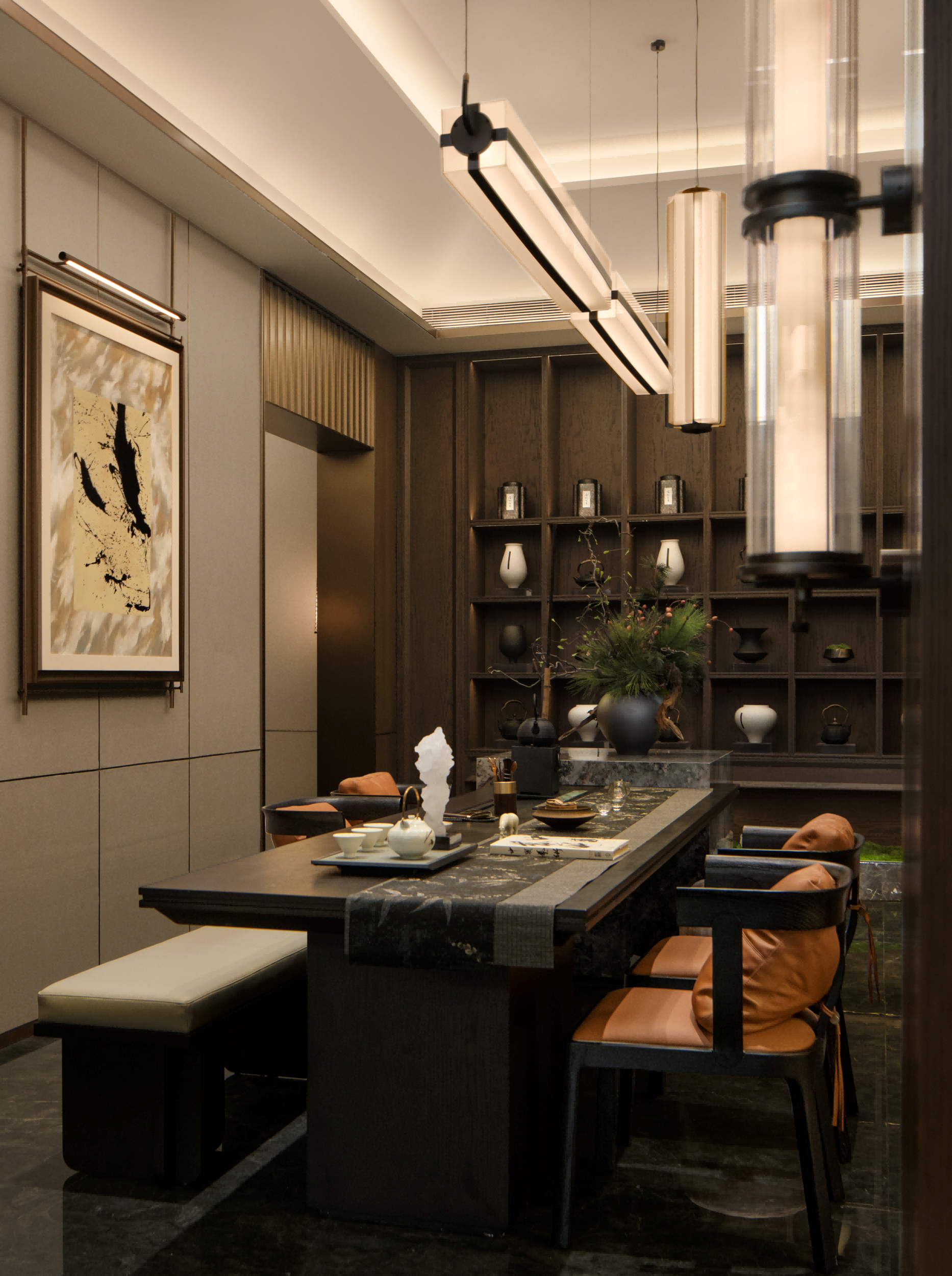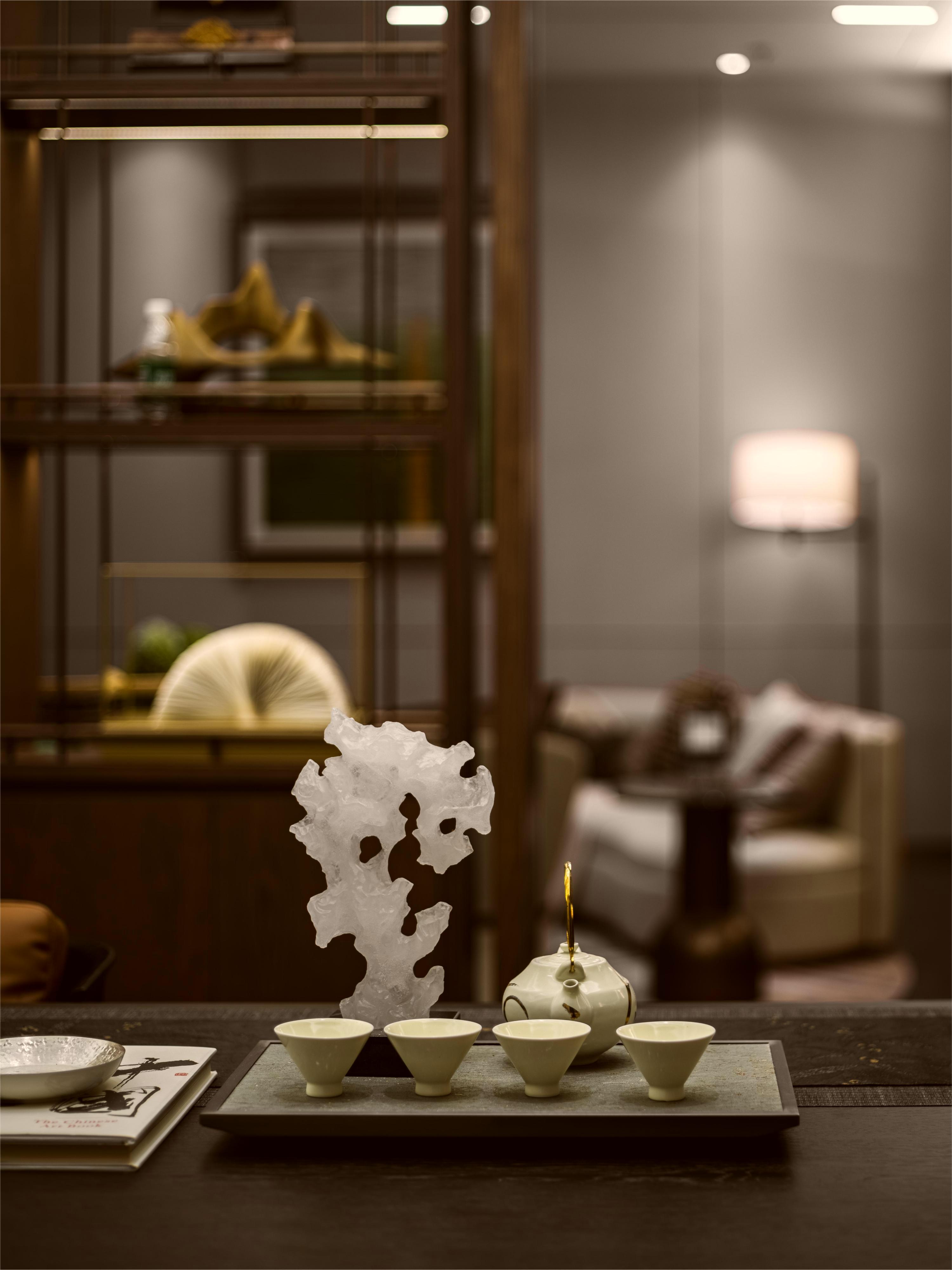 茶室朴拙,最宜安顿身心,静观内省。杯盏器皿,清茶书卷,墨韵柔光被设计师糅合一室,如同一首凝练的禅诗。一室清幽忘物我,空明长伴四时流。