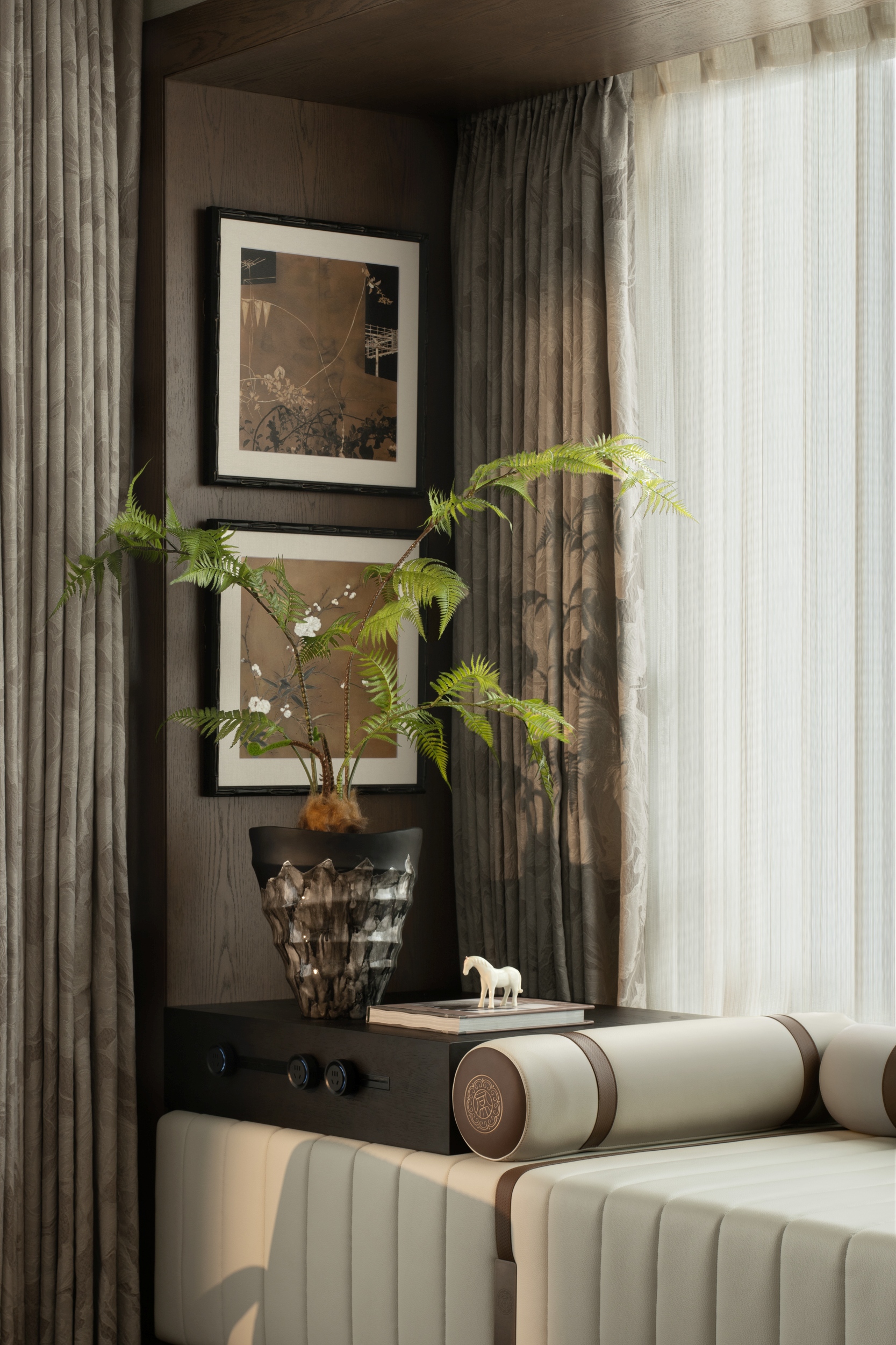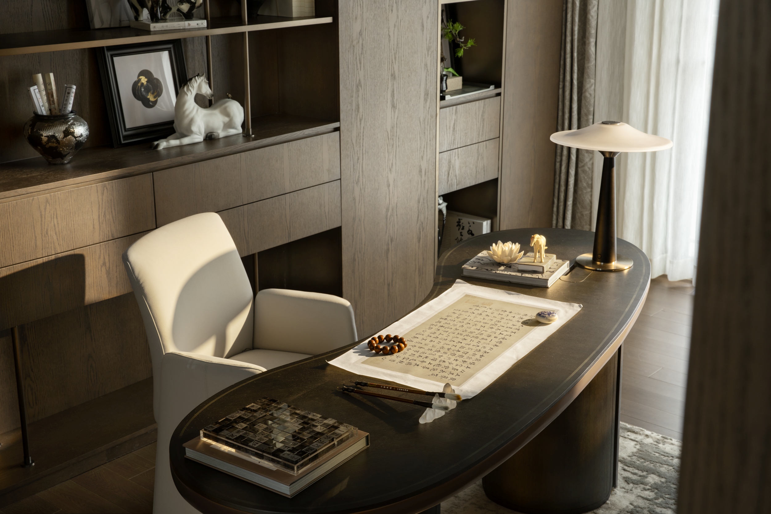 主客厅空间布局规整有序,家具造型简约洗练,这种理性的秩序感,反而衬托出精神的高度自由。当外在的繁杂被梳理净尽,内心方能见天地高远,获得真正的宁静与豁达。空间成功塑造了现代都市中难能可贵的“隐逸”,设计师通过精神价值的契合使居所突破了物理生存空间的简单意义,也正是这种升华,才是都市塔尖人群真正追寻的“豪宅”的价值。