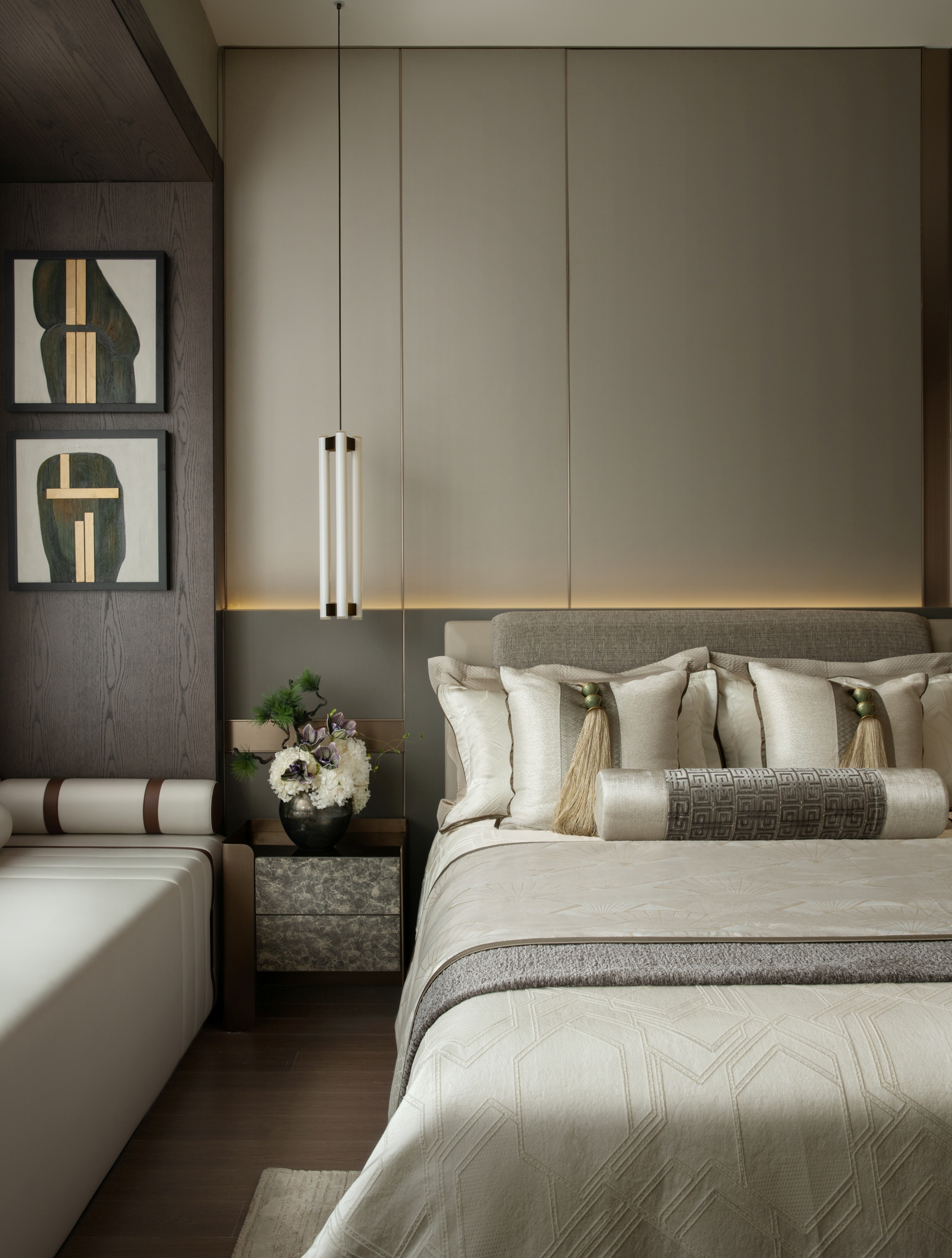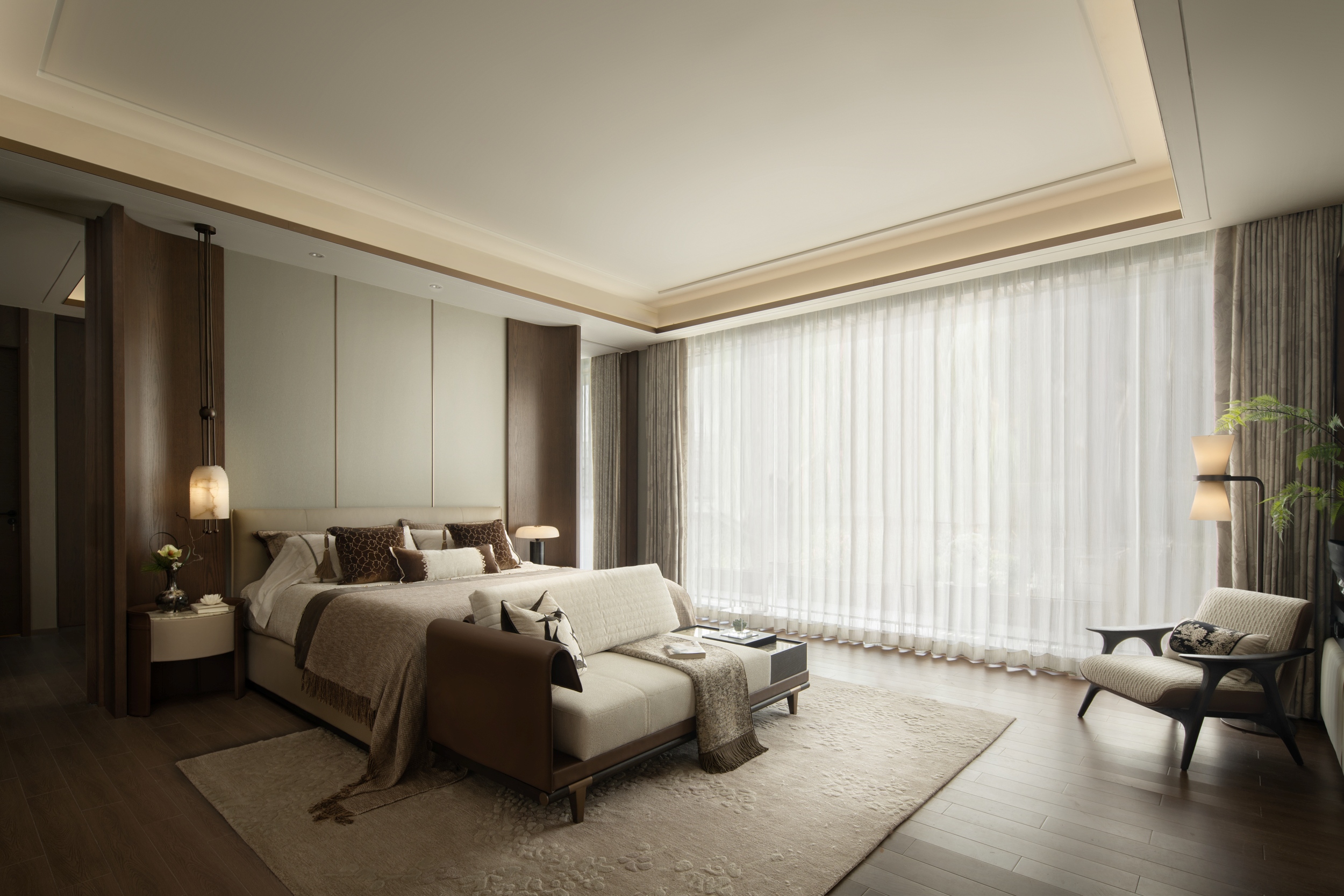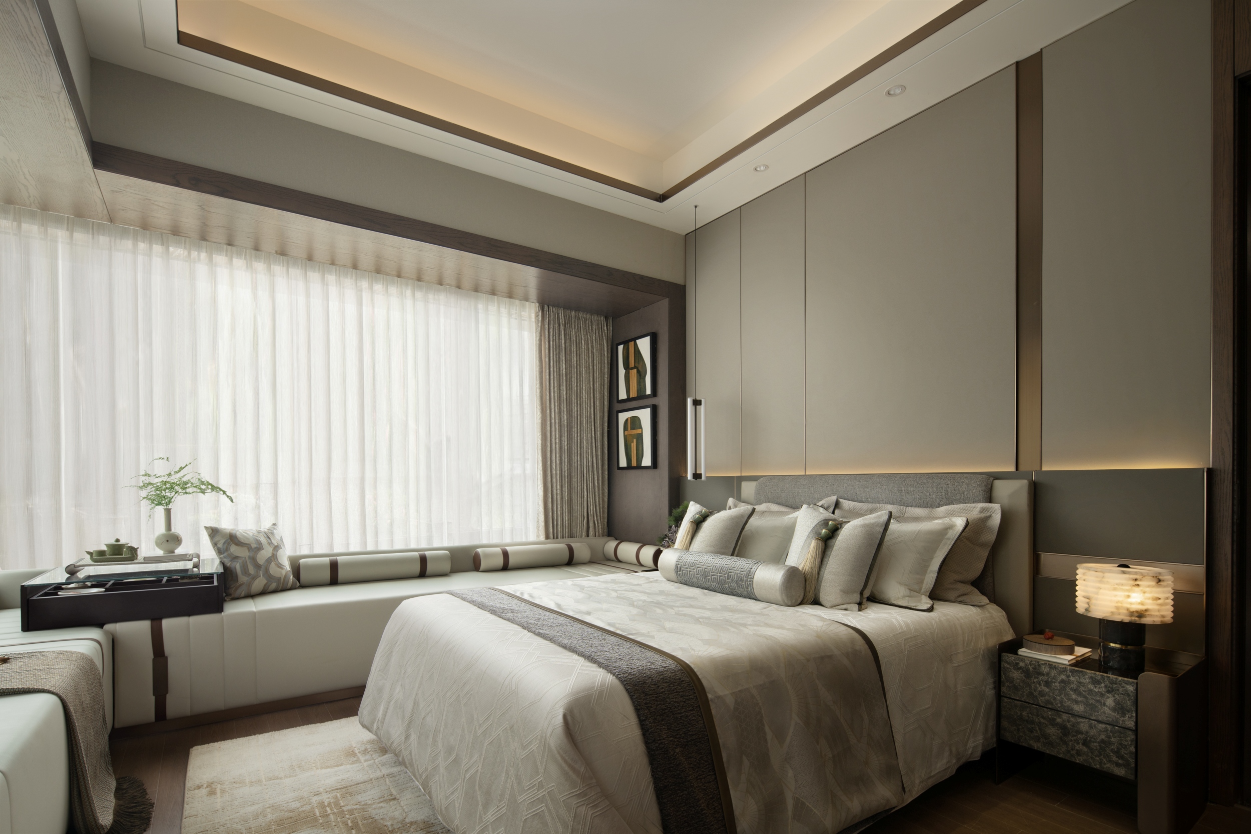 主卧室以一系列低饱和度的中性色——米白、卡其、咖啡棕——作为空间的主旋律,奠定了宁静的基调。现代意奢设计手法将“奢”更加含蓄地隐于细节与体验当中,它摒弃了浮华的堆砌,以极致的素雅与克制,在柔和光影间织就如大地般亲厚的质感空间。