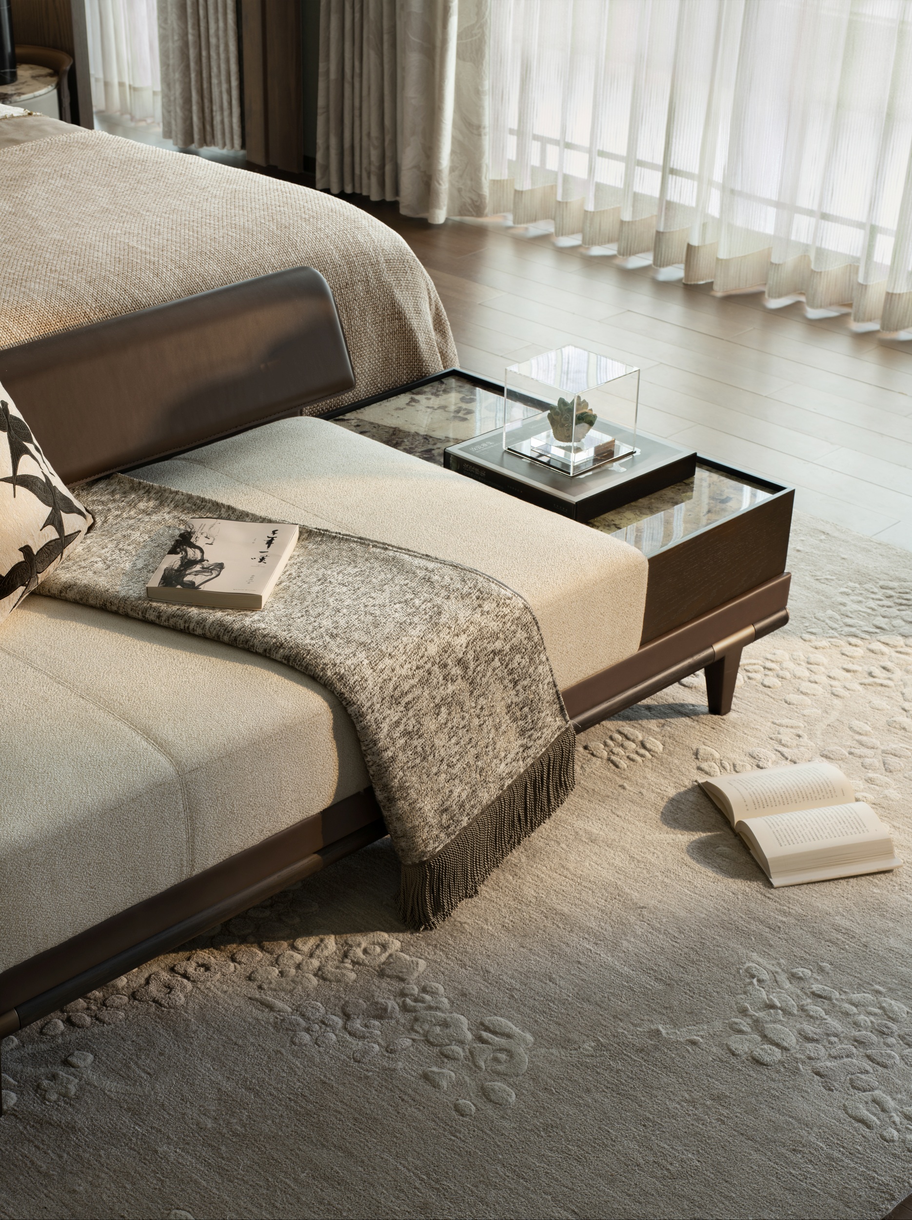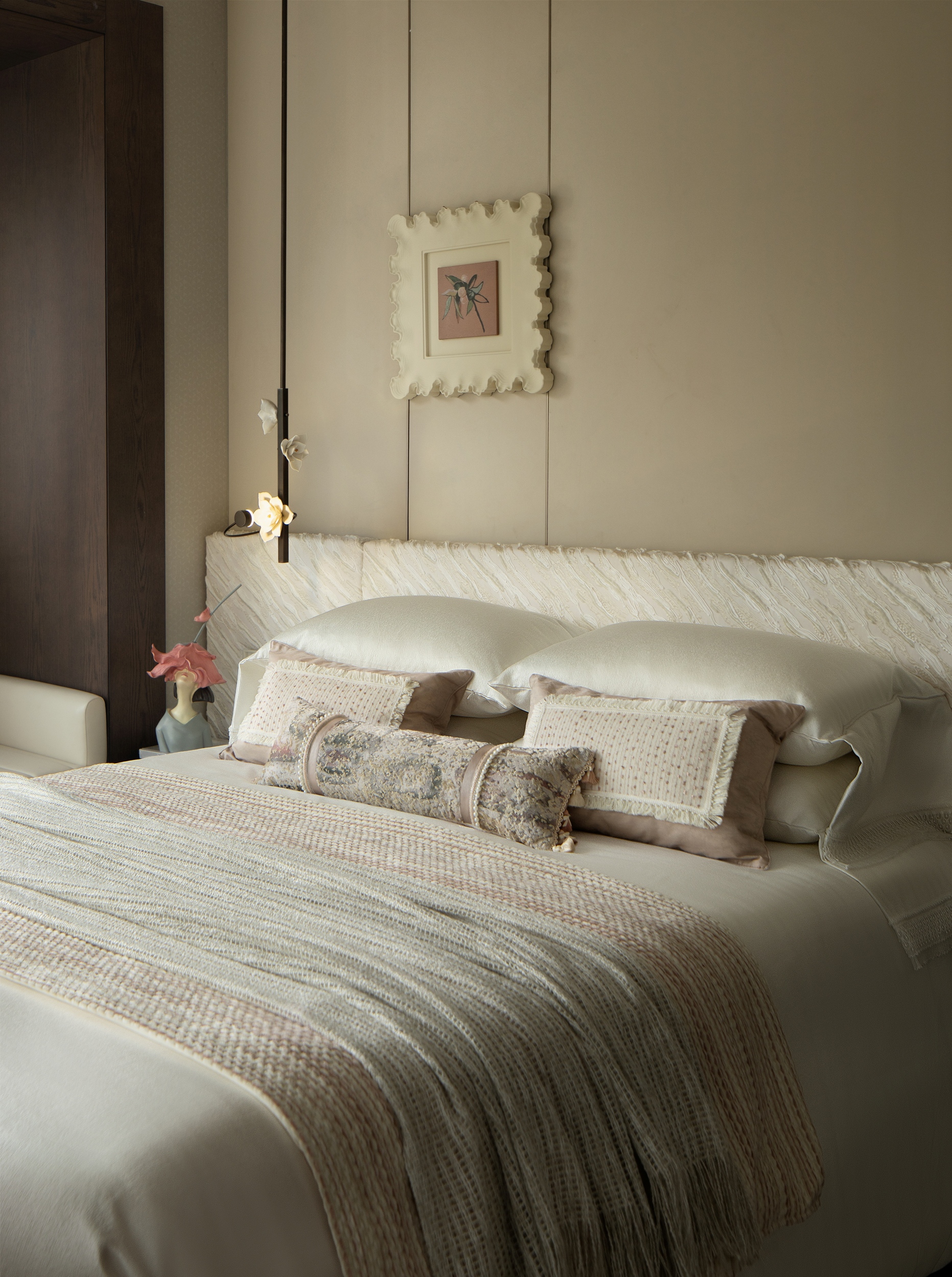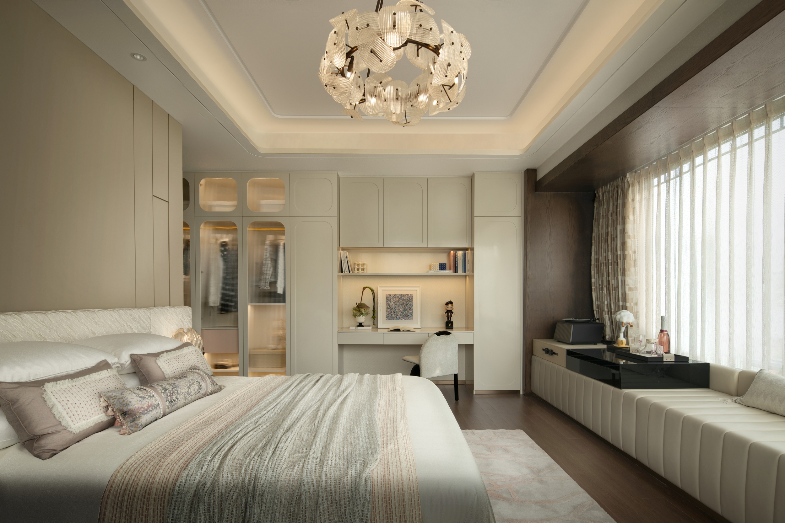 主卧室以一系列低饱和度的中性色——米白、卡其、咖啡棕——作为空间的主旋律,奠定了宁静的基调。现代意奢设计手法将“奢”更加含蓄地隐于细节与体验当中,它摒弃了浮华的堆砌,以极致的素雅与克制,在柔和光影间织就如大地般亲厚的质感空间。