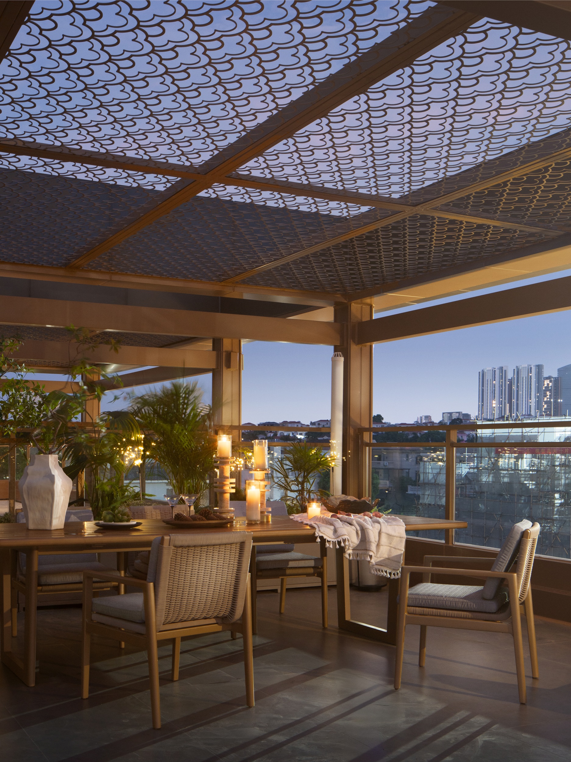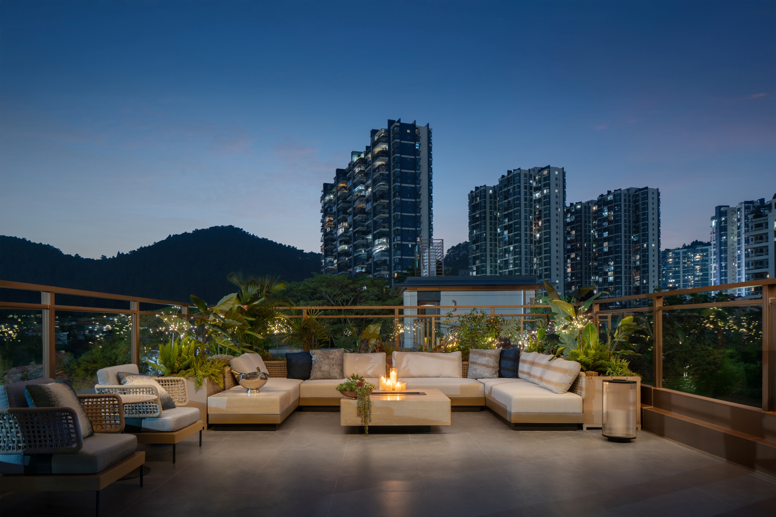 超大尺度的顶层露台如同漂浮的静谧之舟,伴徐徐清风摇曳,承温柔月色天光,揽世间五光十色。既容得下烟火人间的温度,又接得住万里晴空的辽阔。