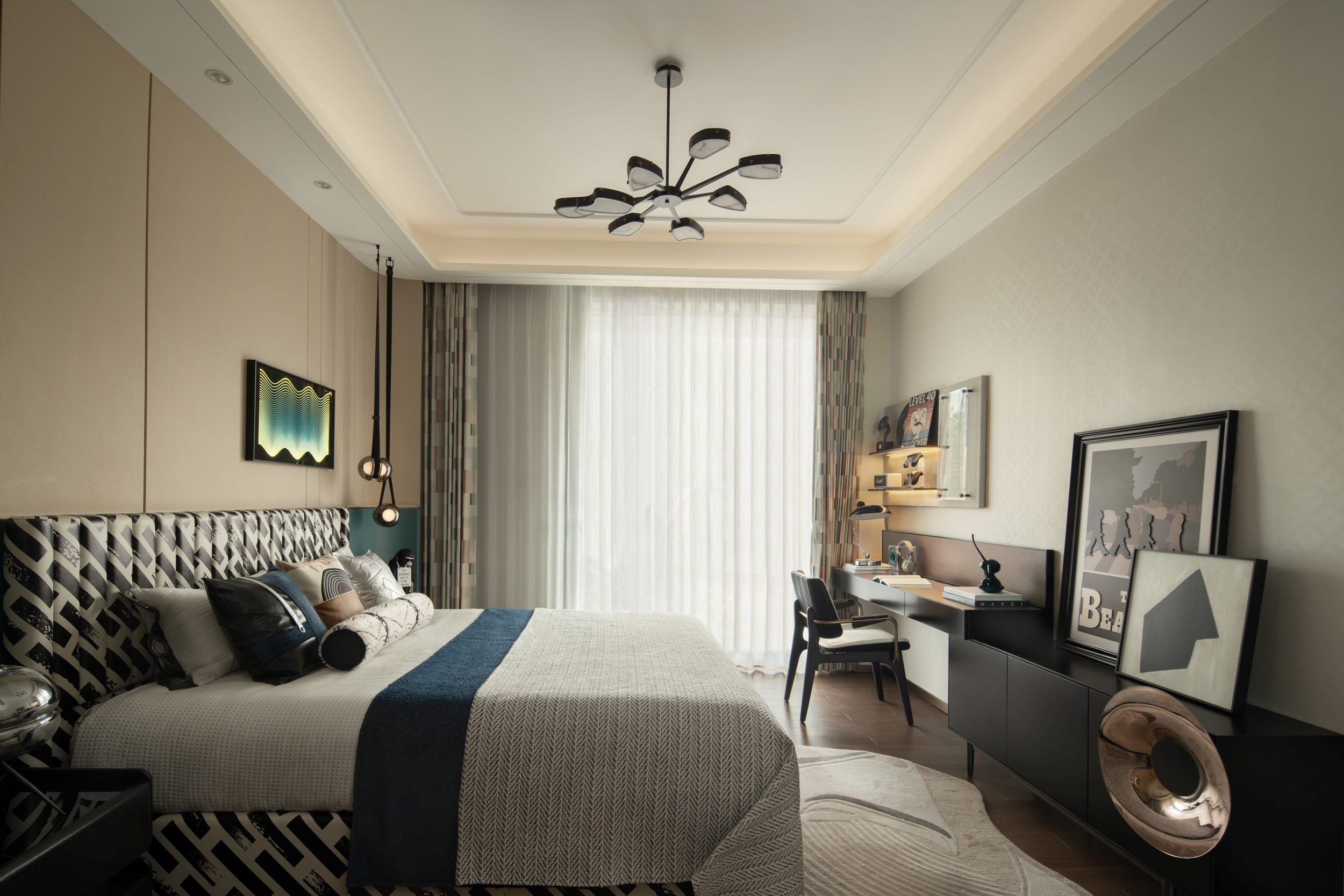 男孩房的设计,精准地捕捉了青年男孩的审美与精神需求。冷静而理性的基底色搭配简约时尚的家具形成男孩房独有的空间秩序。软装设计尊重兴趣与个性,将音乐文化元素融入装饰的细节。在这里,向往自由的灵魂带着对音乐和经典的热爱,可以休憩停靠于任何角落,每一刻的私享时光,都显得愉悦且有趣。