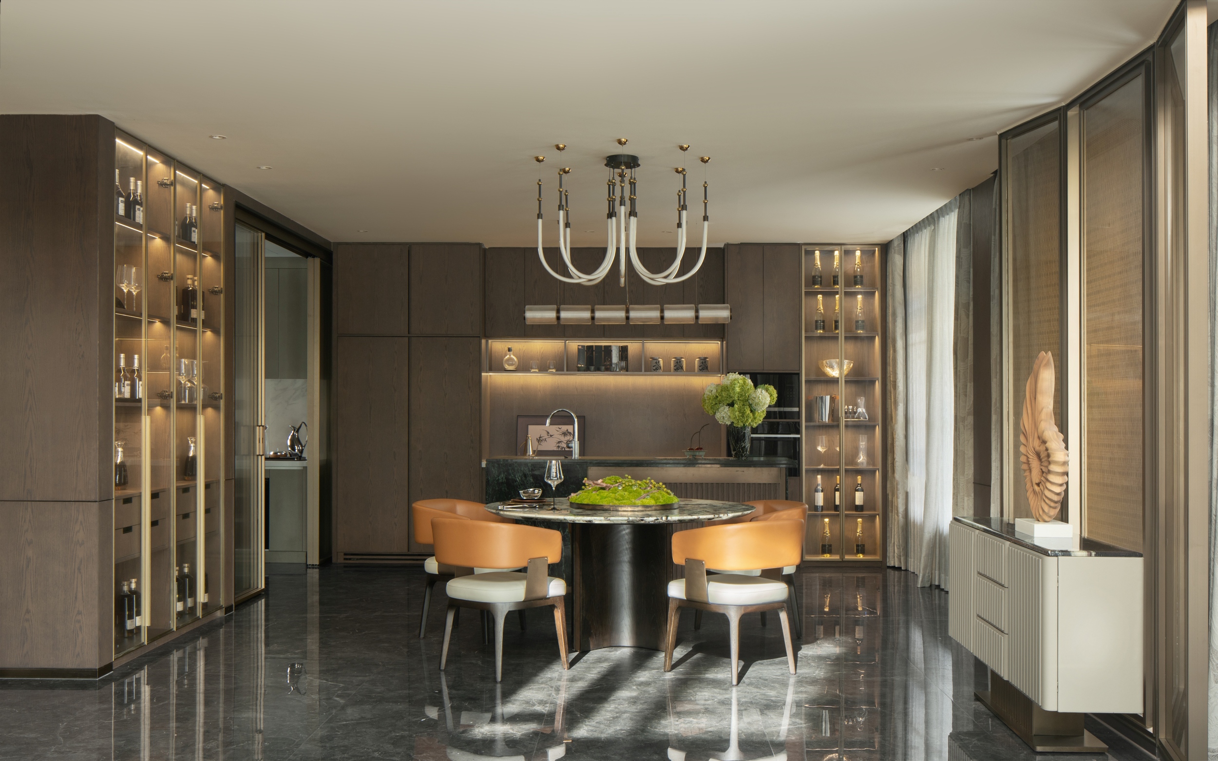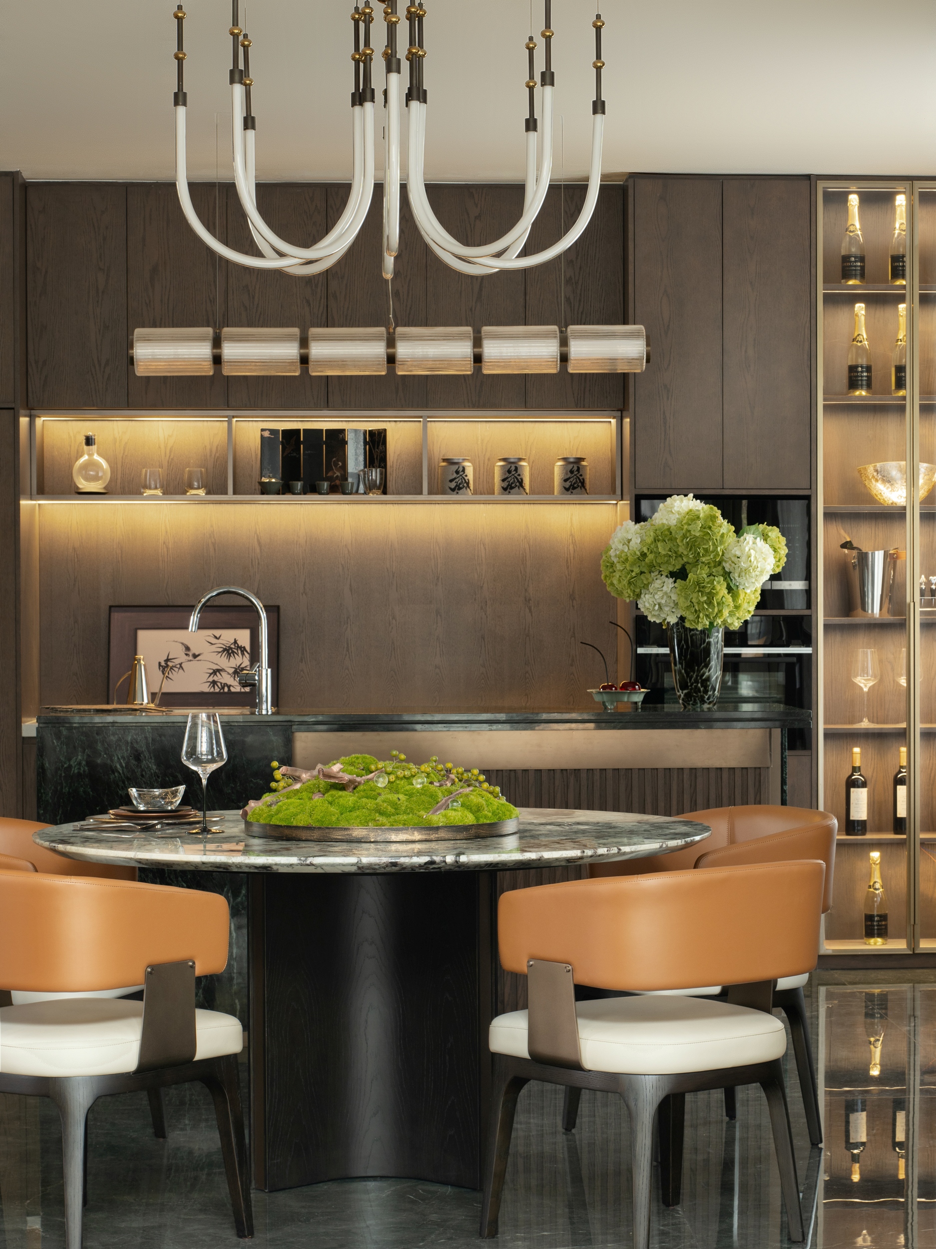 餐厅的风格典雅精致,温润的木色包裹围合着整个就餐空间,形成空间敦厚饱满的底色。中央的圆形大理石餐桌凝聚着家的休与戚,见证四时流转所上演的不同烟火剧目。一箸一勺间,不仅是美味的分享,更是情感的共融。