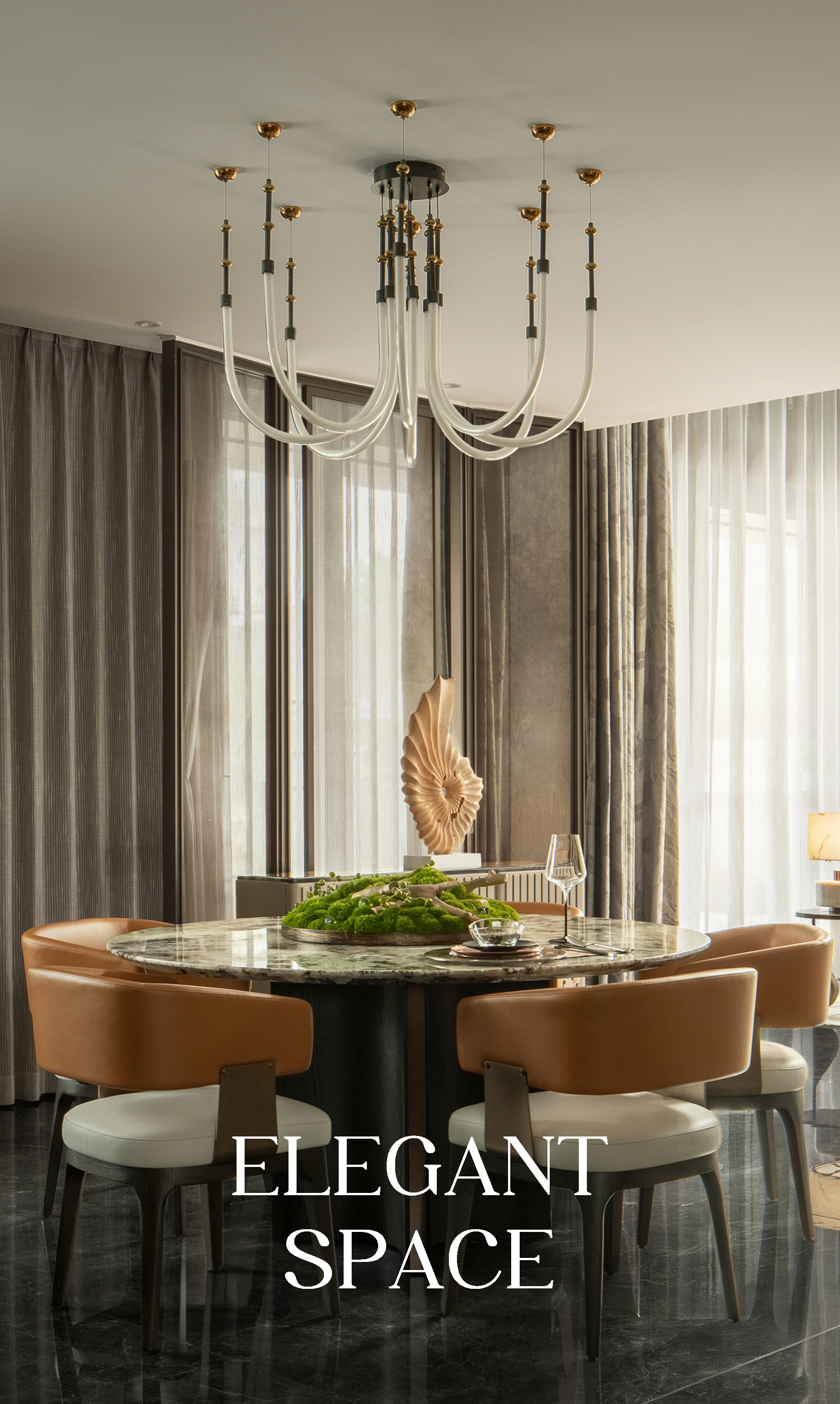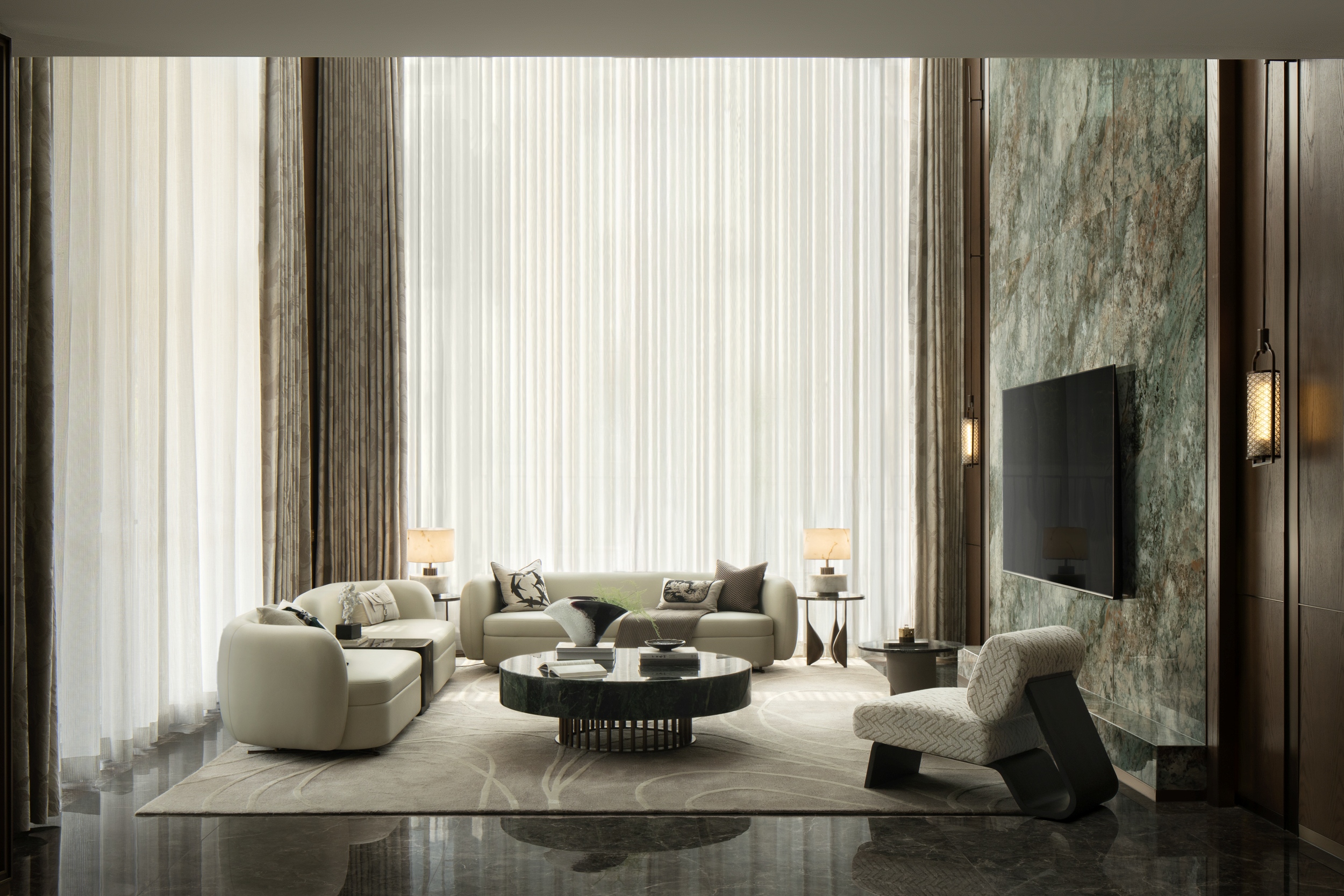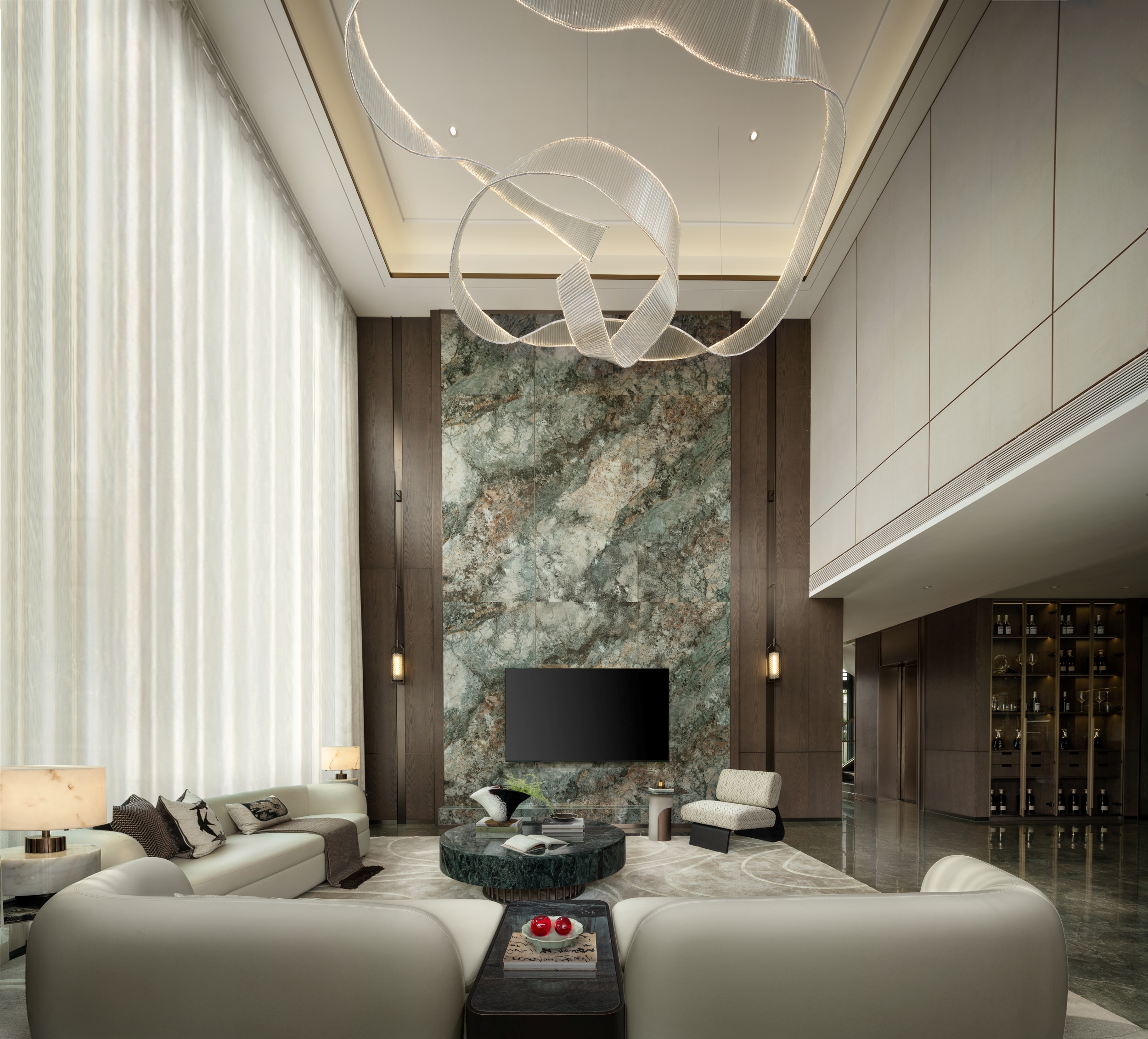 一层主客厅约7米挑高,电视背景墙的奢石纹理透露出自然的苍劲与奇秀,轻盈纱帘垂下如流水飞瀑,带状艺术吊灯矫若游龙,翩跹萦绕,如山中的缥缈云霞。设计师取意“云峰耸翠,流水迢迢”的旷达之境,以现代质感与形态塑造东方写意山水之美,为居者营造静观自然,与天地对话的环境。