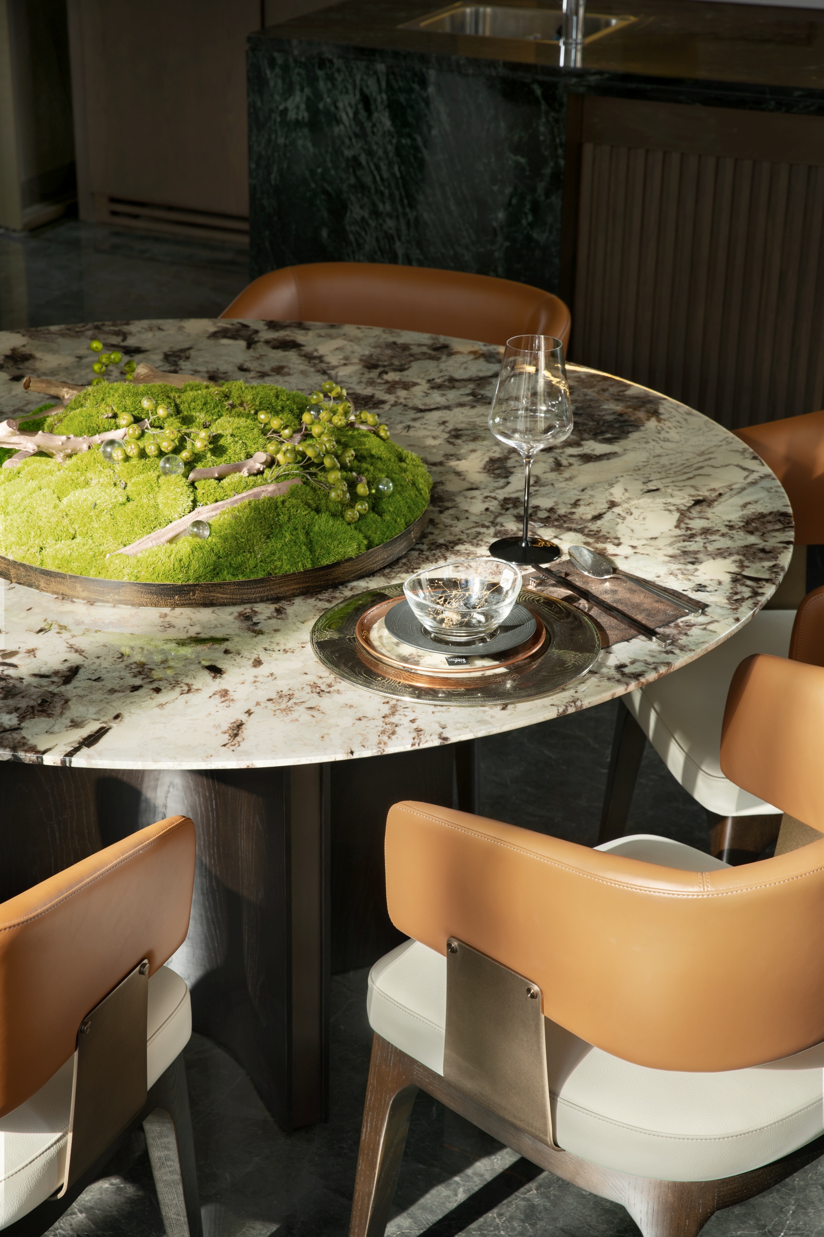 设计师以圆为核,以光为引,将中国人骨子里对“团圆”的眷恋与“人伦”的礼序,悄然融入每一处细节。圆桌象征家庭的圆满聚合,链带形状的吊灯隐喻家族纽带紧密相连。正是在这日复一日的围坐共餐中,人伦礼序得以潜移默化地传递,家风德训在此席间自然而然地传承。