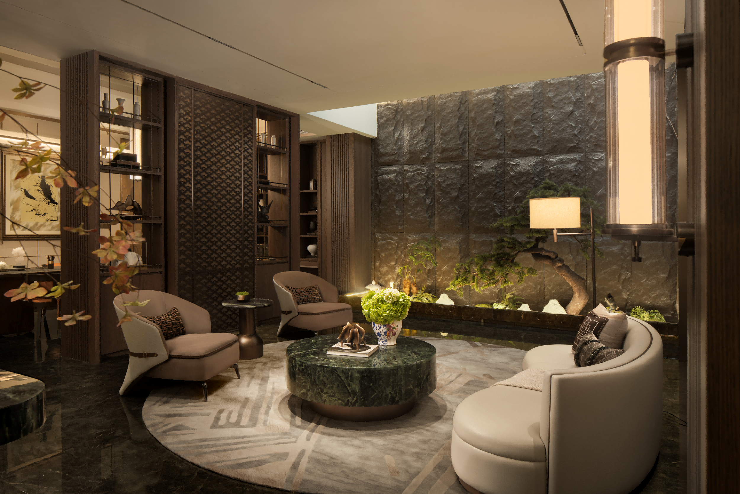 地下层以意式简约的手法融入东方古韵打造为隐逸闲趣的沙龙会所。采光井引天光入内,洒向粗粝的石墙,与昏黄的氛围灯光交织成静谧的光网,幽然无声抚平尘世喧嚣。古松与山石造景为空间的空灵与隐逸意蕴写下注脚,是主人回归自然,静隐修心的内在追求的现实呼应。