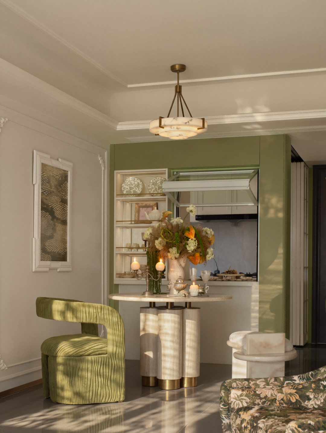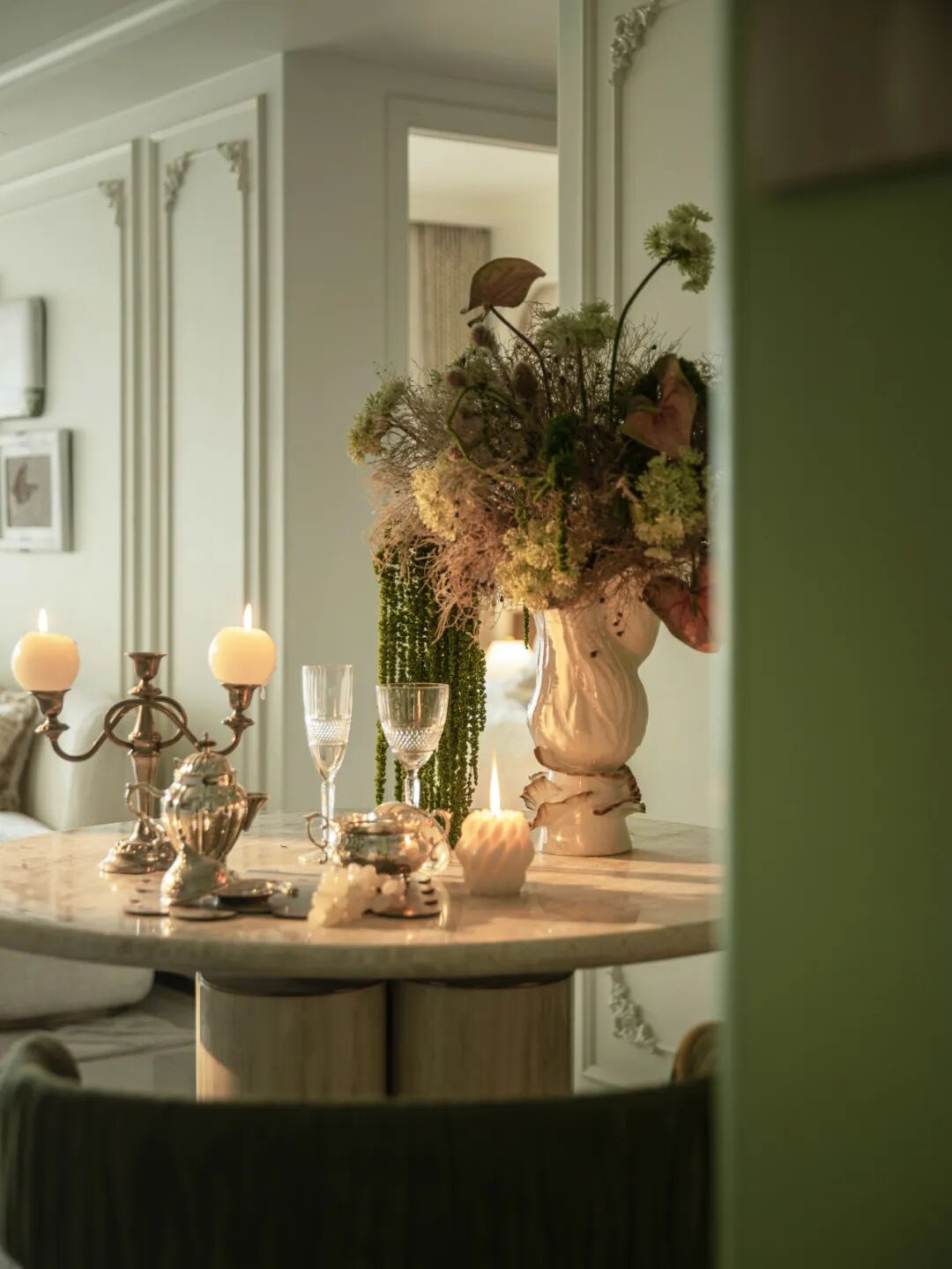 轻奢质感的大理石餐桌与绿色丝绒椅体现主人对质感的追求,古典风情的烛台、茶器、台花是法式优雅最显化的表达形式。每一件单品的精致外在,都在诉说巴黎艺术化的日常,刻写法式最内核的基因。