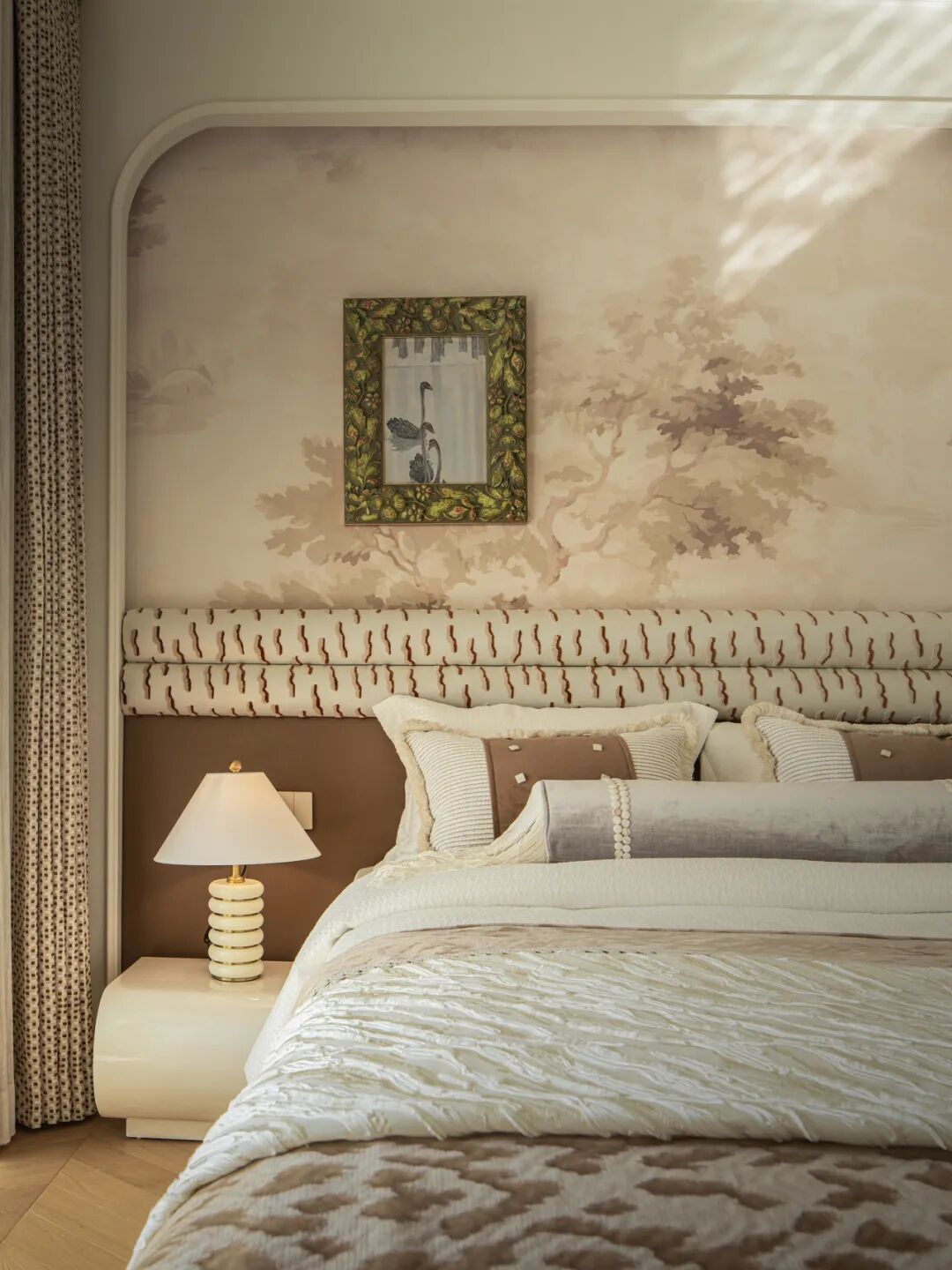 主卧室利用橄榄绿、米白、浅杏等配色渲染了明媚平和的春意,让主人仿佛置身春日林间享受到与自然近距离对话的治愈力。软装撷取了法式宫廷风的精髓,又做了很多化繁为简的精妙处理,让法式复古线条的经典之美得以呈现,又兼顾了现代追求的利落感与实用舒适性。法式对称的秩序美感在主卧中多处体现,为卧室营造出高级的整洁感与稳定感。而通过饰品、灯饰、挂画的不对称修饰,又适当打破秩序的沉闷,提升了空间的个性张力。