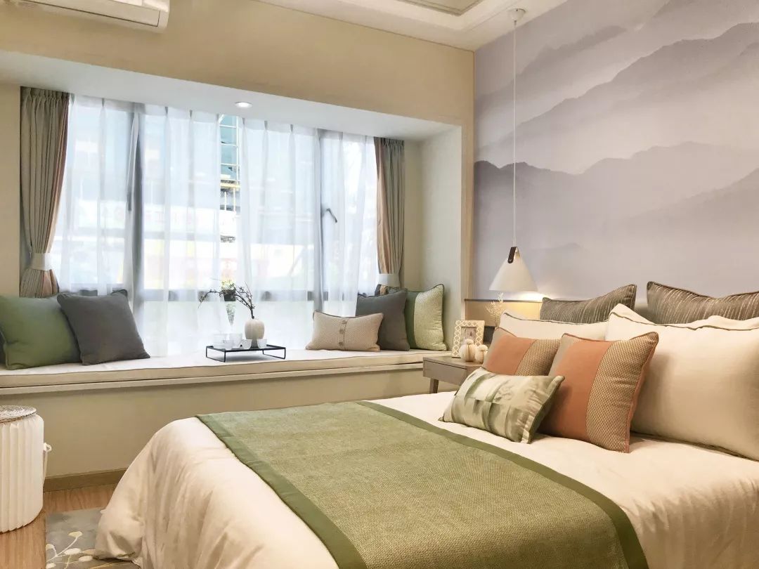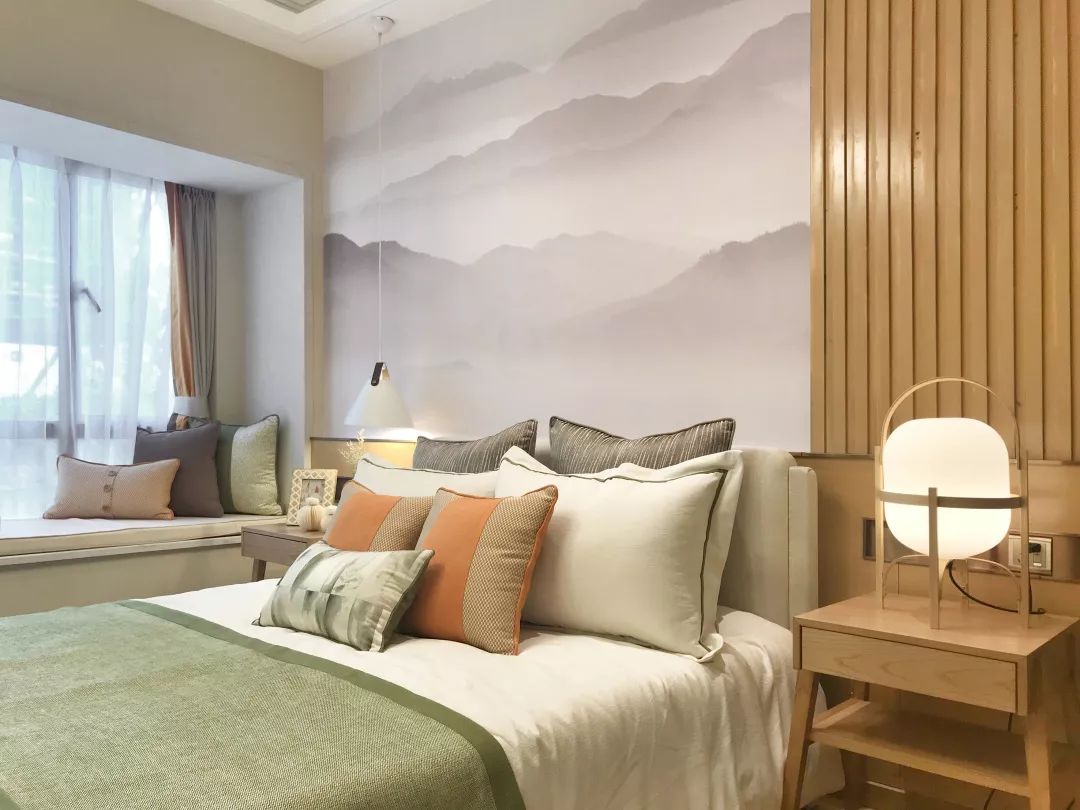 远山如黛,卧室背景墙上淡淡的水墨画,意境深远,即使身居室内,心灵和眼睛,也能享受着大自然的美妙。