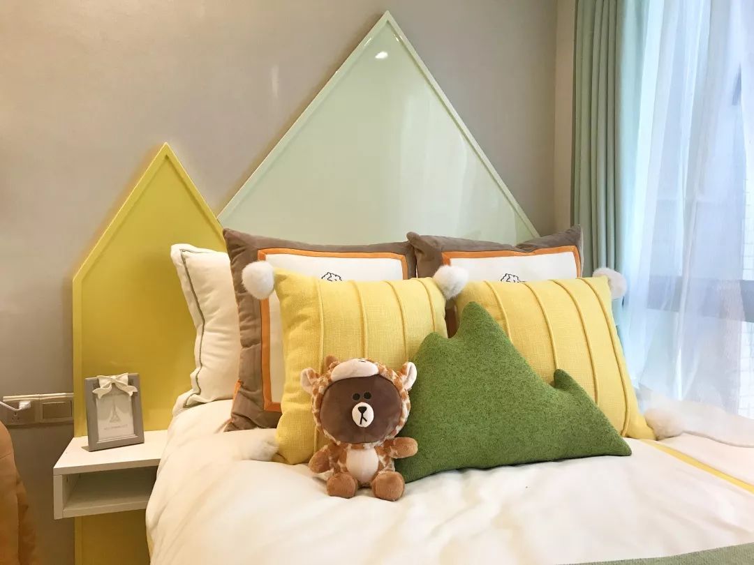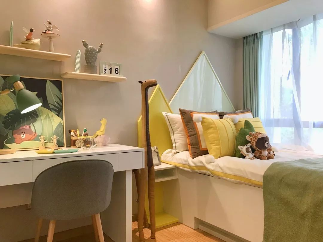 儿童房采用了梦幻森系的设计风格,配色温馨、活力满满,房间里满布了可爱的小动物与清新自然的画作,堪比日本动画大师宫崎骏的作品,一派天真童趣。