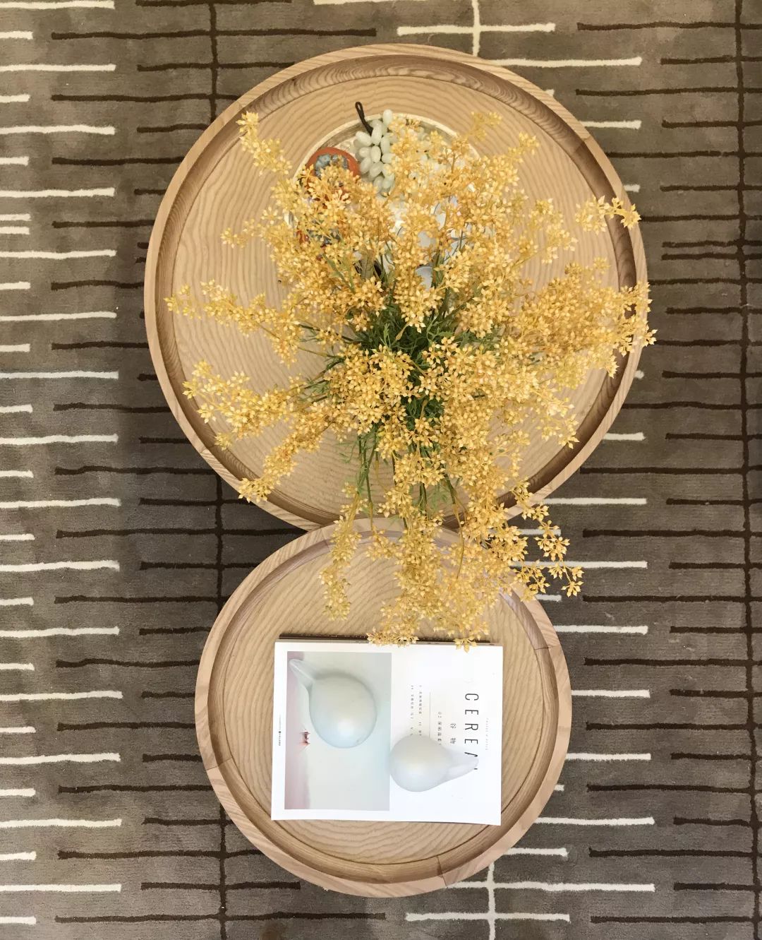 茶几上的黄色花束是点睛之笔,细碎的黄色花朵与木质圆几相互映衬,为平淡的生活增添诗意,在家也能轻松邂逅自然的美好。