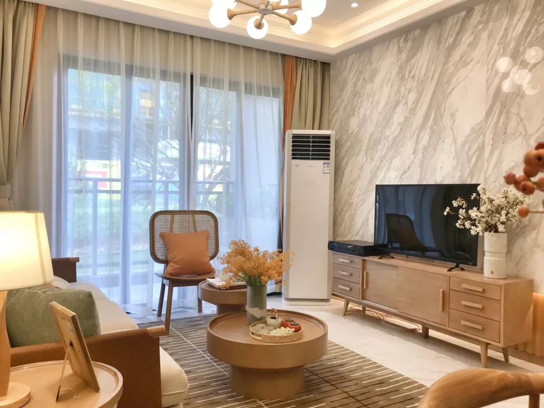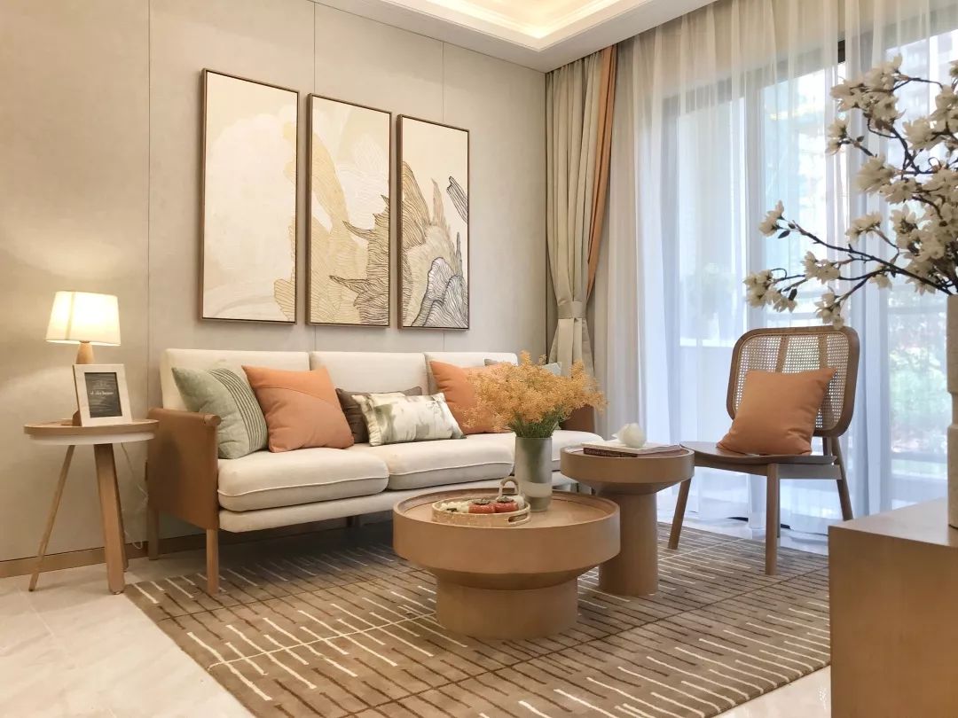 客厅采用低饱和度的暖色调,显得格外温婉内敛,生活气息浓郁,很好地营造出一种舒适温馨的家居氛围,生活其中,仿佛置身于山间田园一般,使人身心舒畅,内心宁静。