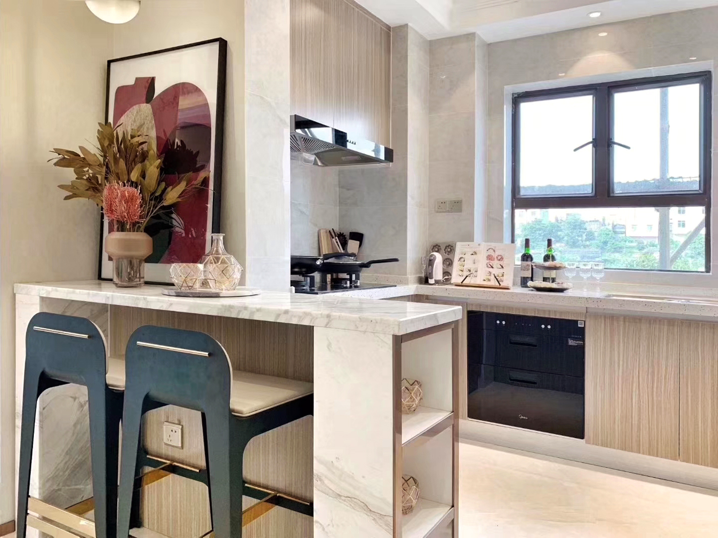 ▲在厨房旁,设计师巧妙地利用宽阔的走廊,设计出一个休闲吧台,可以用作与家人朋友聊天畅饮的地方。