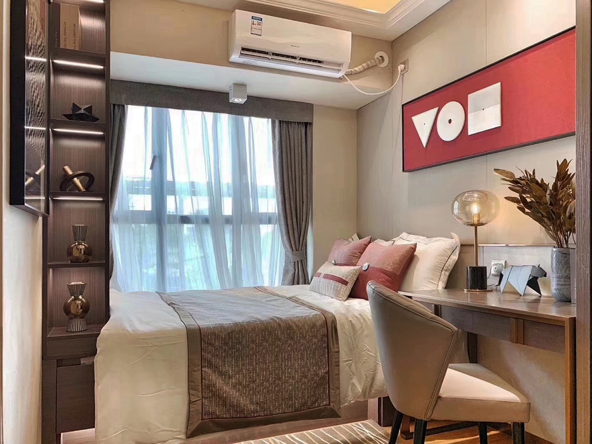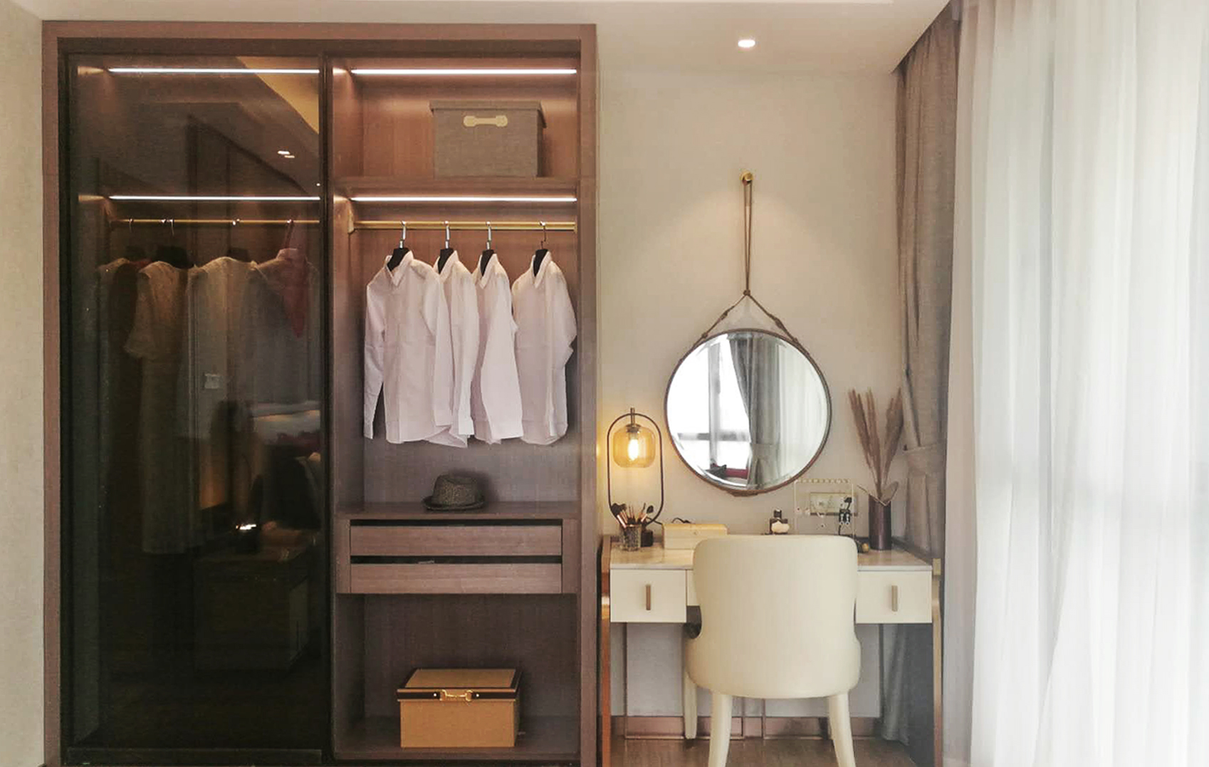 ▲一踏入主卧,便能感受到大面积的窗户带来的良好采光及随之而来的开阔感,走道一侧则布置有衣柜和精致的梳妆台。