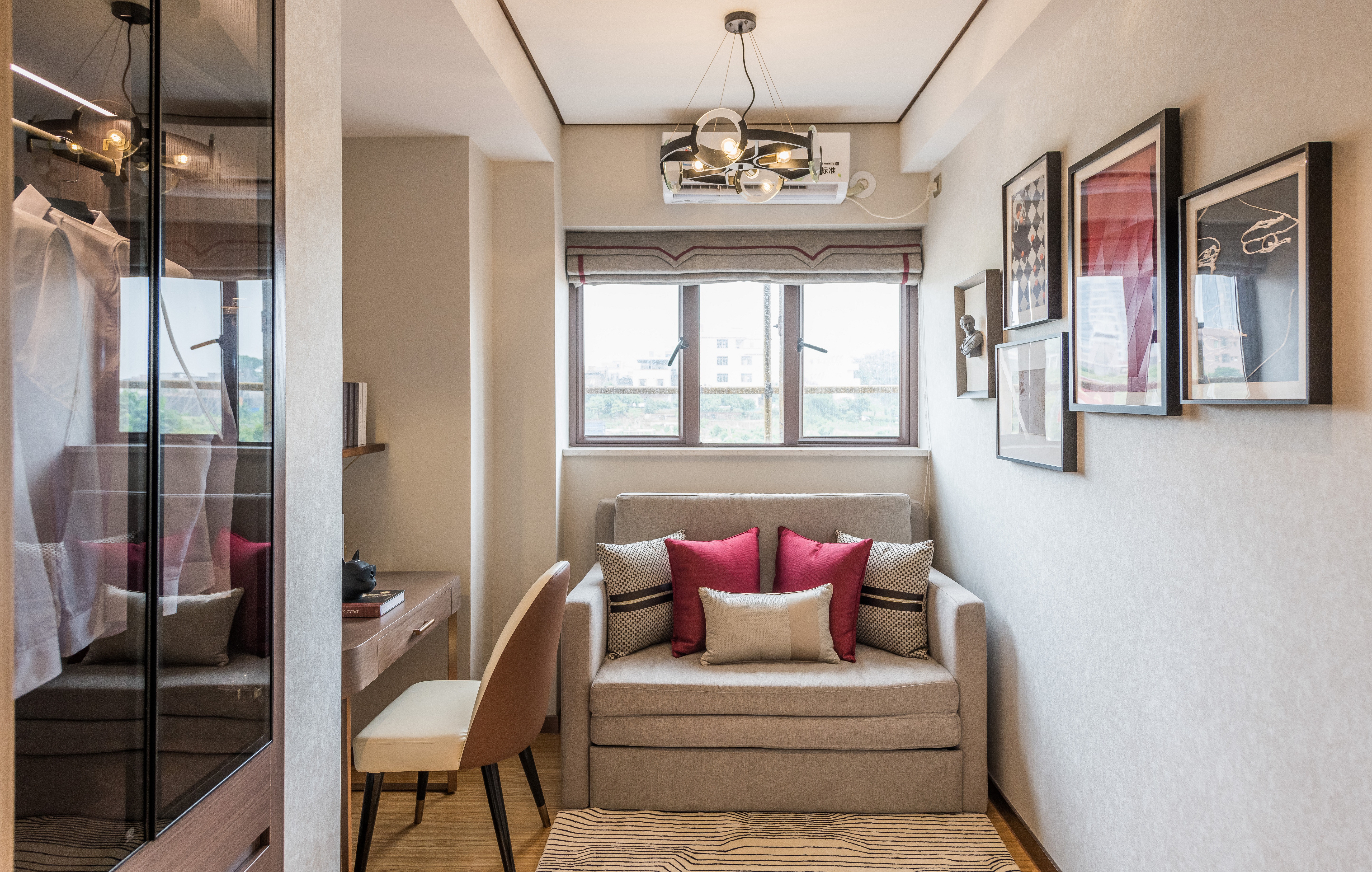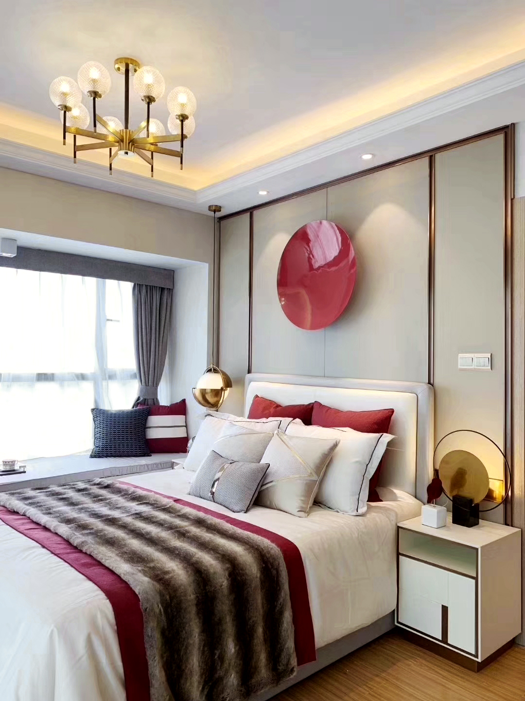 整个房间大面积以稳重雅致米色棕色为主,墙面的红色实物画起了点睛的作用。