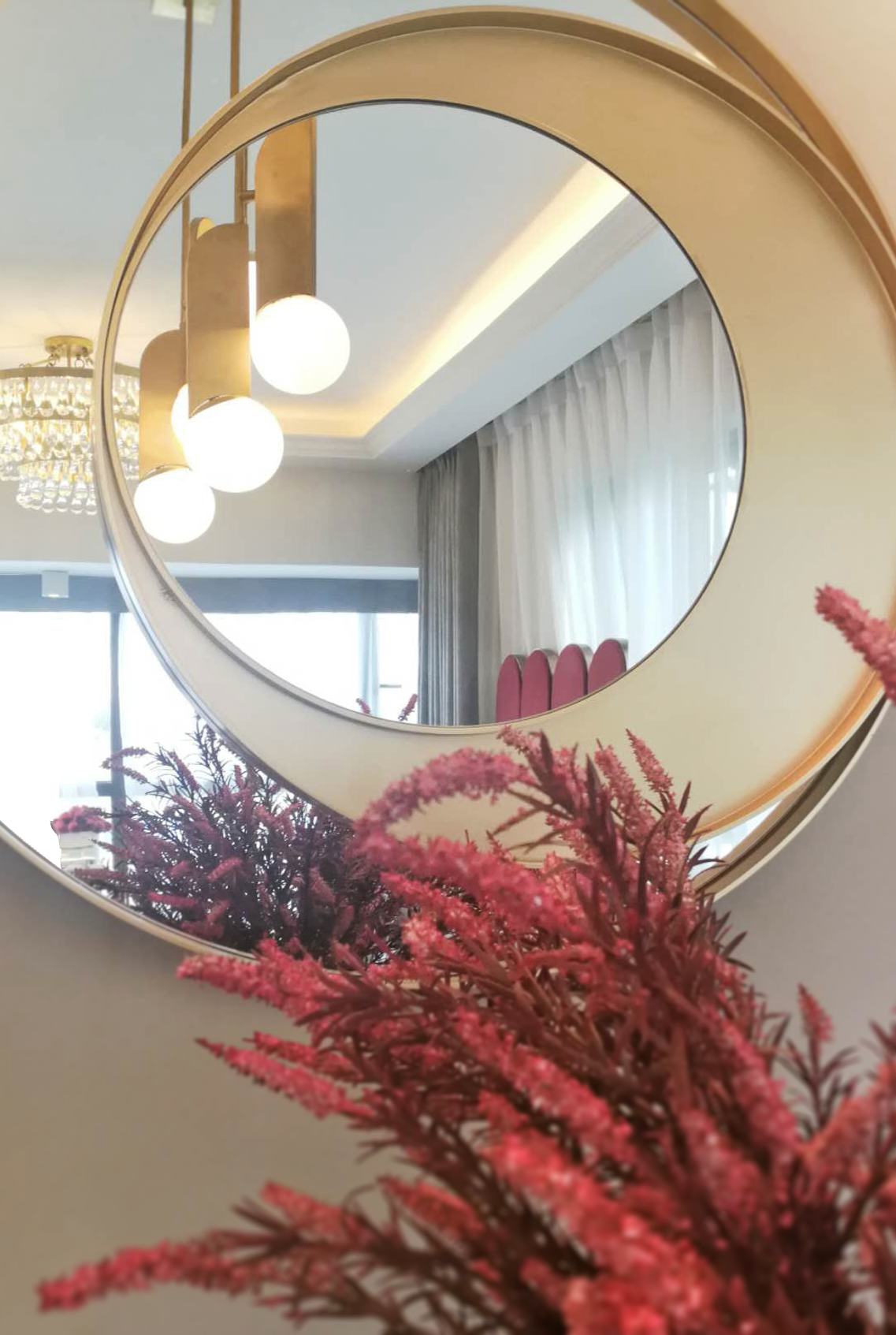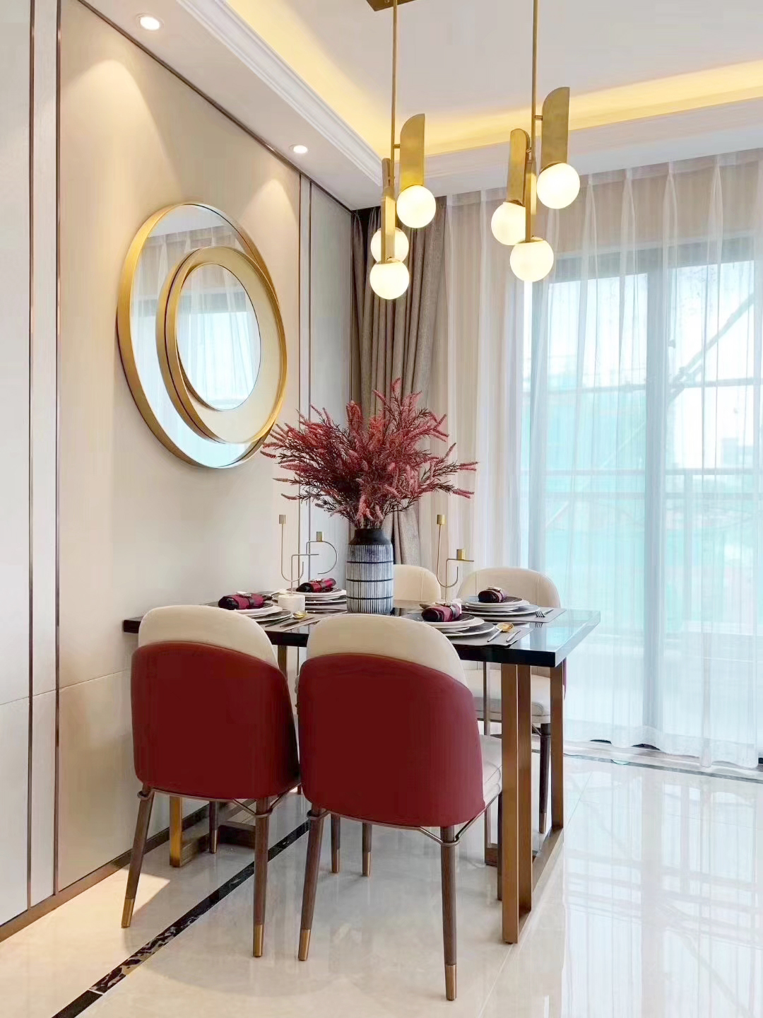 ▲餐桌旁的装饰圆镜中映出现实中的场景,增加空间延伸感。皮质餐椅的拼接还有精致的金属装饰构件都诉说着对品质、对精致的追求。