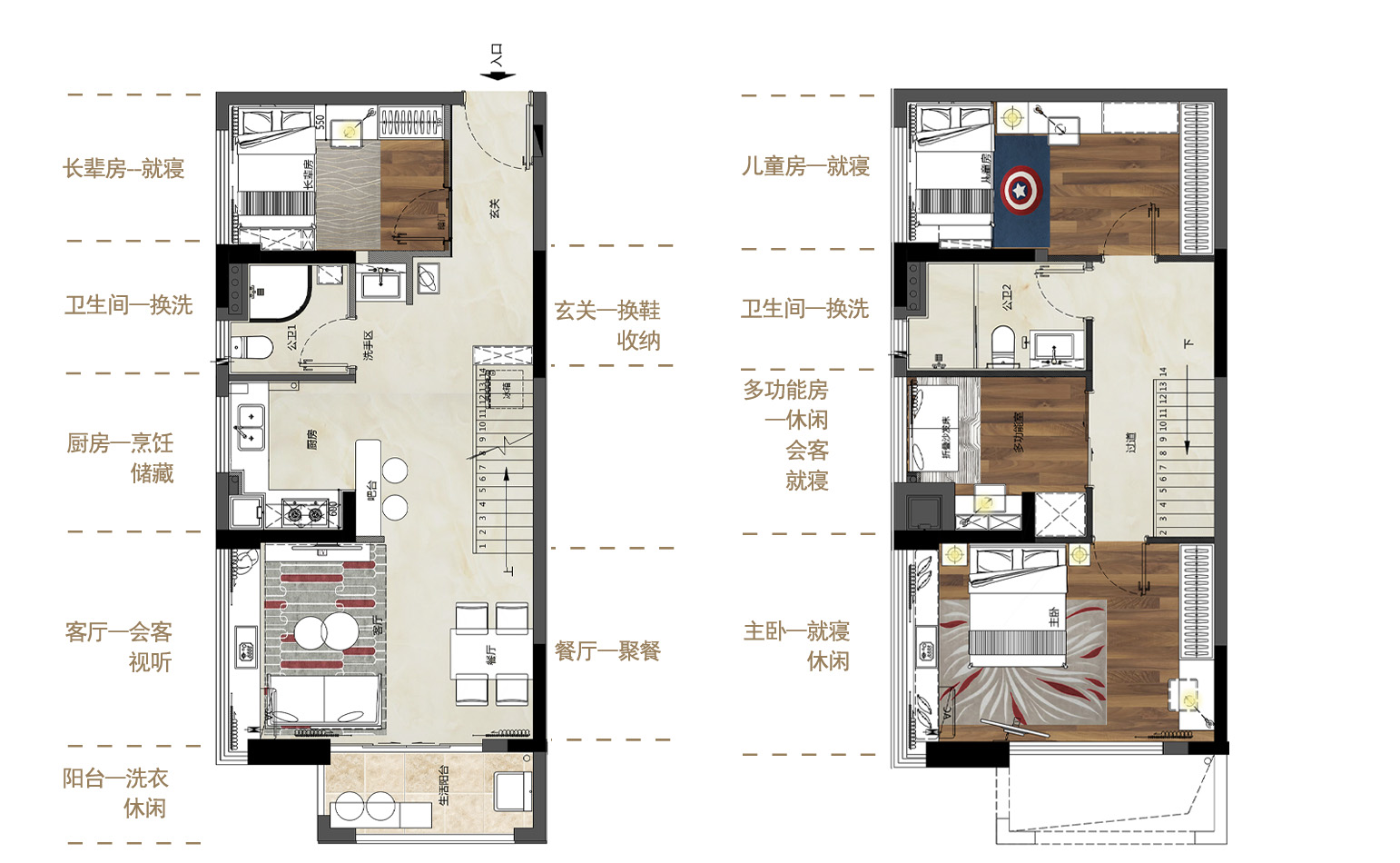 中海联睿品项目位于广州增城官湖地铁旁, 208户型为复式设计,拥有六米层高大四房。本案定位为三代同堂,一层是客餐厅及长辈房等生活空间,二层为主卧、儿童房及书房。
