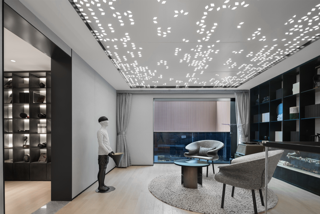在空间采光面与私密空间分割均匀的已有资源的基础上,我们率先利用景观资源优势,将空间划分为公共多人区及私密私属区两大区域,基于空间资源的分配,我们大胆地通过材质的选择来强化空间属性,以精制的工艺来诠释细节。