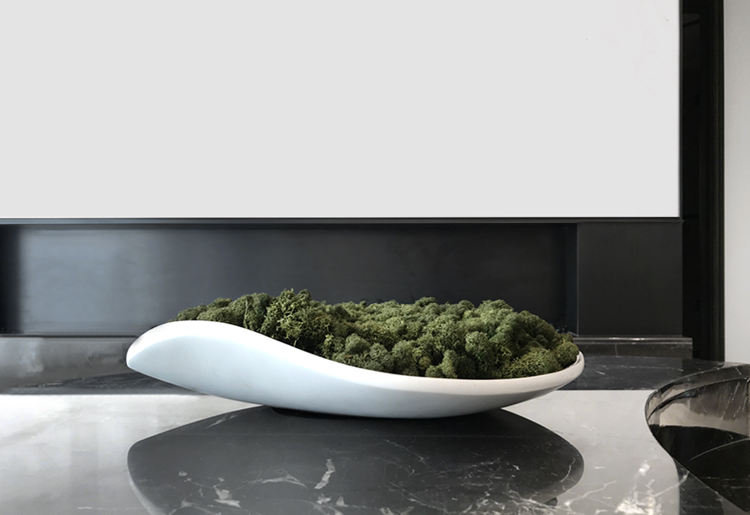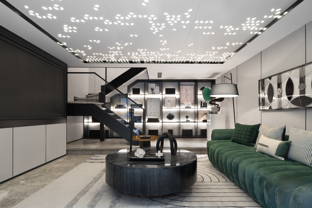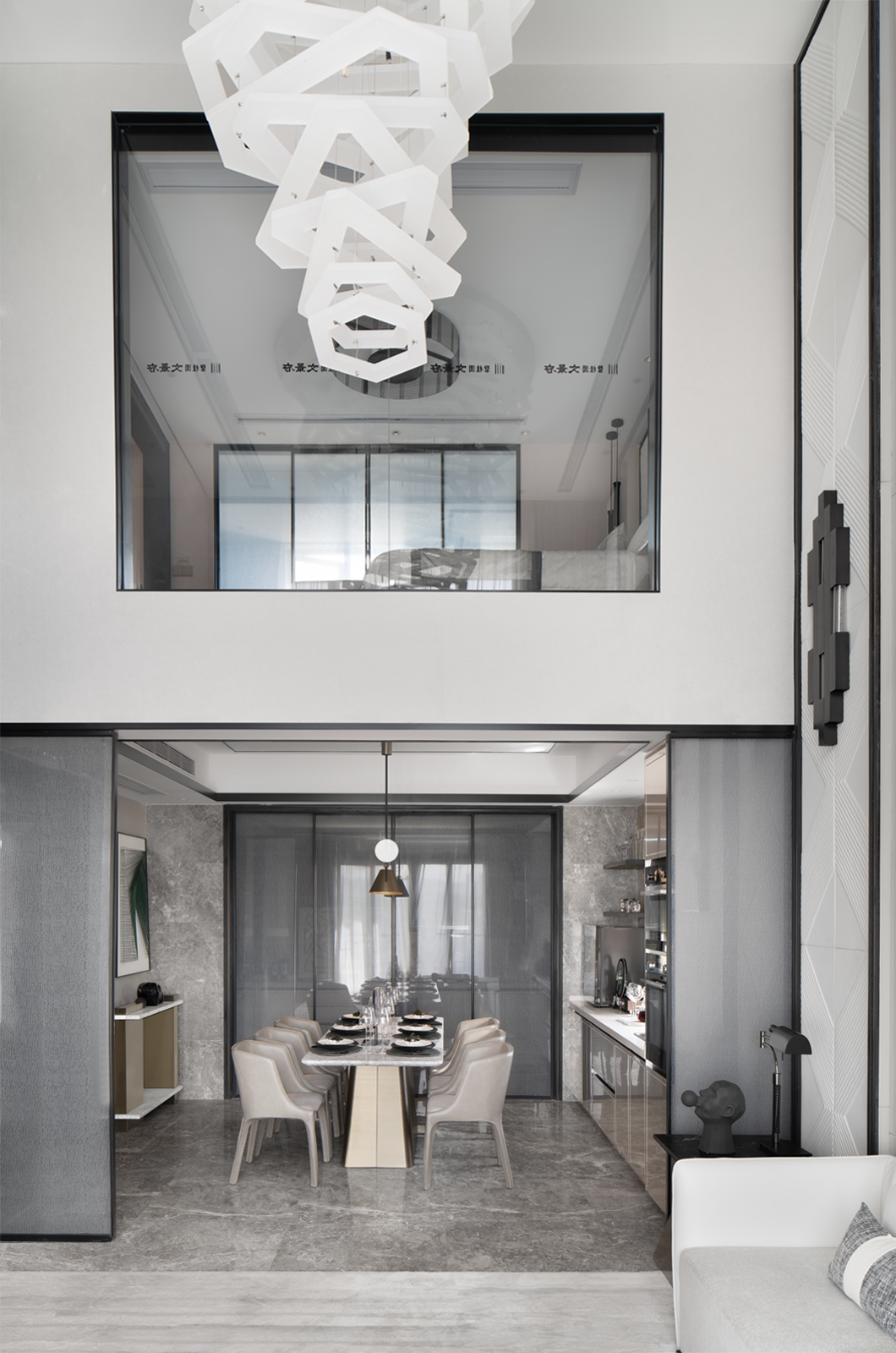 在客餐厅的设计中,围绕现代山水萃取提纯,以光影为主角,色彩上以不同的明度与材质导入,绿色是苔绿的斑驳呼应自然感,白色是烘托光影表达的基底。通过不同材质实验性的有机组合,去展现光影的质感。