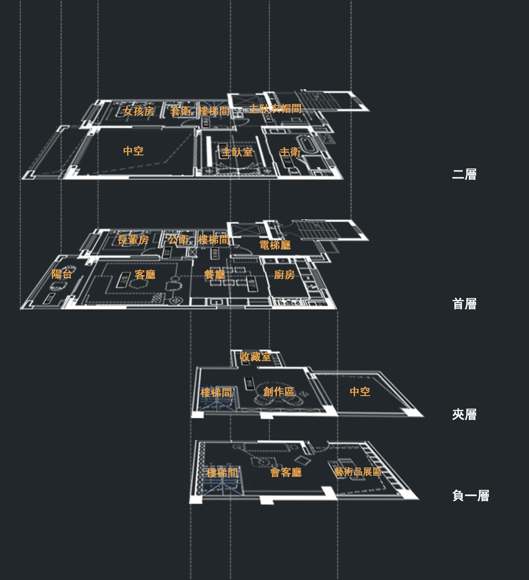 空间上我们设定一家五口居住,长辈以便利安全性考虑居住于首层,二层则是男女主人及女儿的居住空间,功能分区上首层主要满足日常的生活居住,负一层及夹层则用于拓展爱好的“秘密基地”。