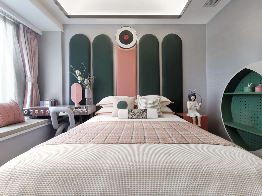 大面积的飘窗使儿童房形成一种舒适轻松的氛围,弧形家具在保障儿童空间的趣味性同时也考虑到了安全性,整个空间的色调摩登绿与莫兰迪粉色各半,视觉上无论何时都舒适自在。