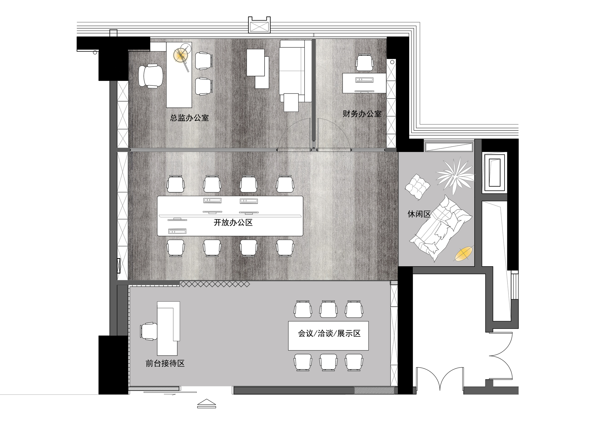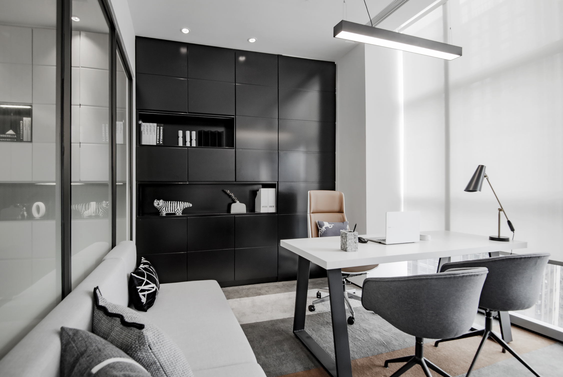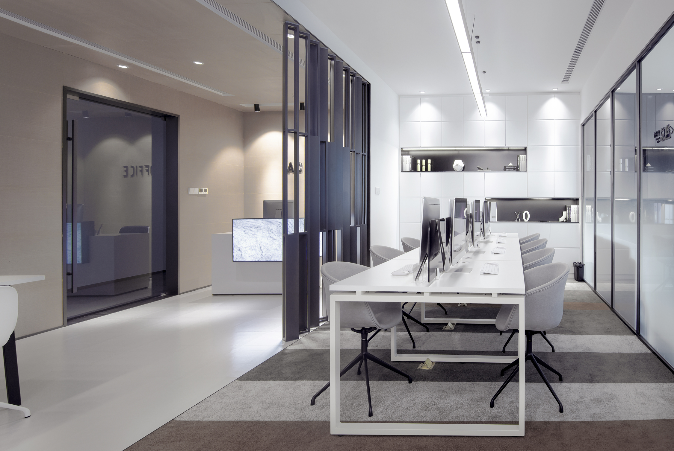 区域整体用灰浅木色为基调,为黑白灰的整体增加一丝暖意,黑钢镂空造型屏风的设置,以提高办公区的私密性,营造若隐若现的视觉效果。