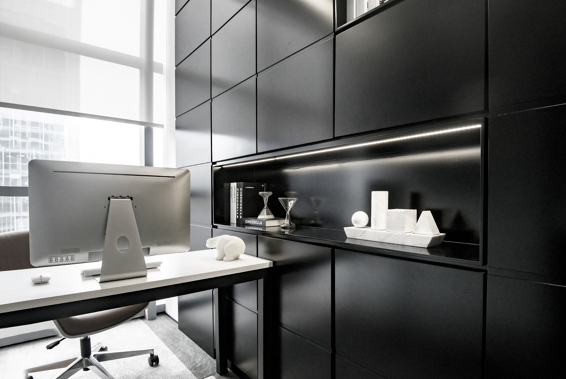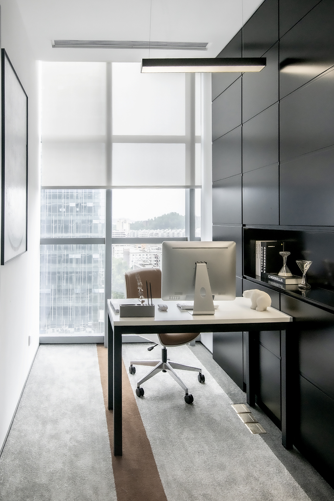 白调是整个重新建构的空间中保持稳定的部分。而黑色柜体造型的体块、渐变的玻璃、灰色地毯、家私形成的不同色调,不同质感的灰色,是整个空间中最活泼的元素,与白色相得益彰,使整个空间呈现出静谧而不沉闷的氛围,进而在影像后期处理中,达到不同体块快速精准地拆分和聚合的效果,带有视觉幻像的意味。这一切,则完全是分析——表现的结果。
