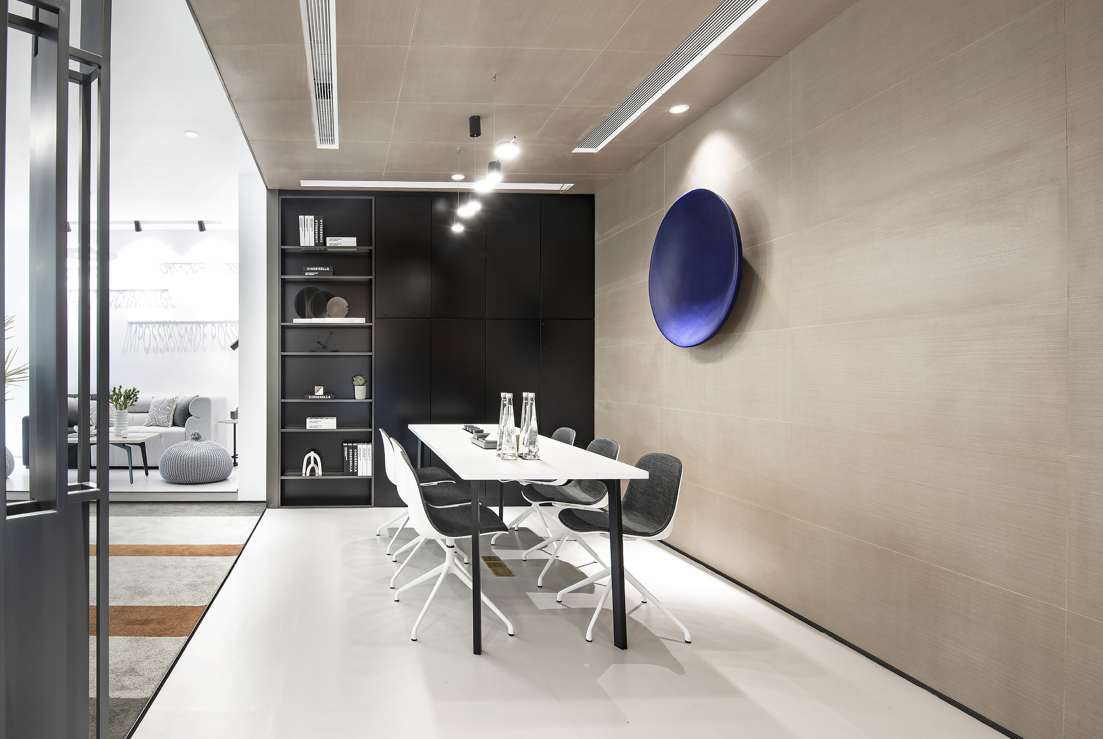 会议室与接待区相连,既能作为客户接待区,也能作为“头脑风暴”的萌发地,将空间利用率达到最大化!此处用低饱和度的蓝色圆形挂件,提升了空间的轻松感,也寓意每一次的待客之道或者议程结果都能圆圆满满。