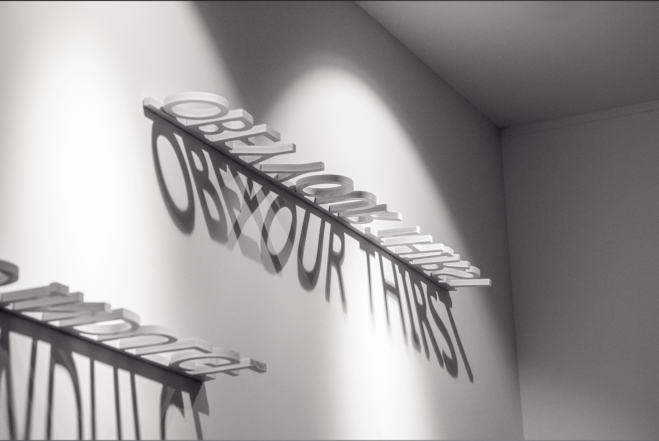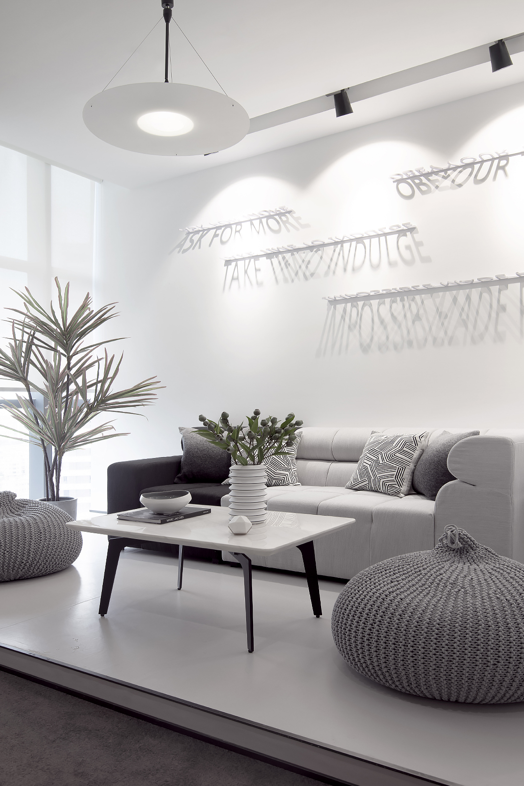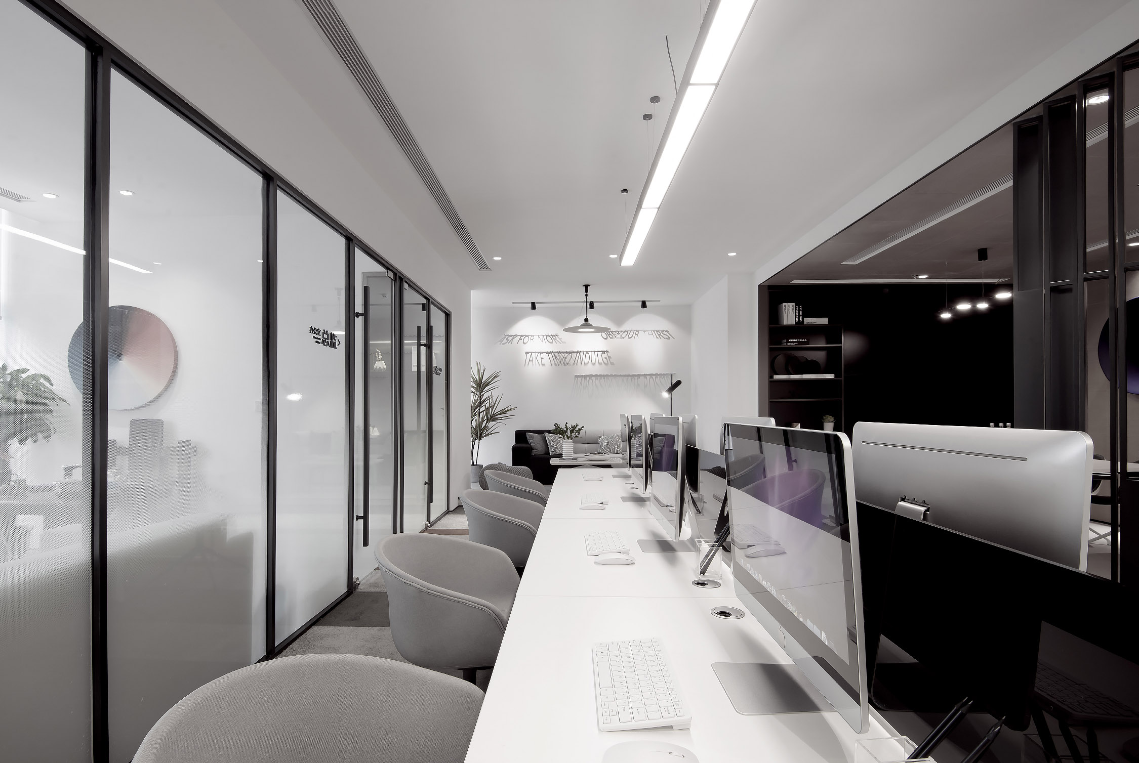 素雅白墙上搭配立体字母的光影效果,创意独到且增添活泼之感,在工作中感受身心自由的同时,也获得工作的乐趣。