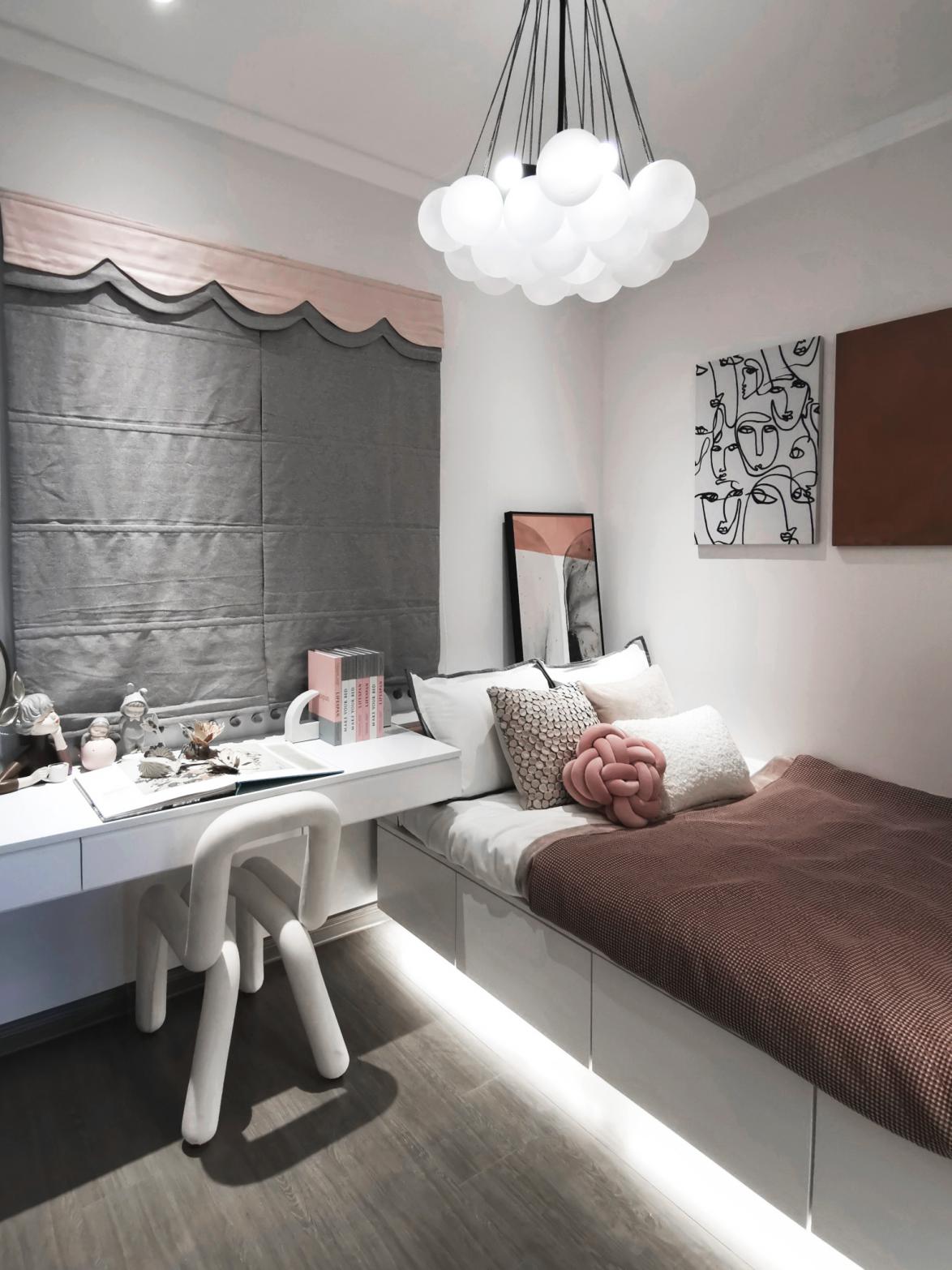 ▲女孩房在与整体色系一致的基础上,添加了儿童特色的多彩色,简洁且具导向性的学习区域、衬托想象力的装饰物,陪伴着孩子快乐成长。