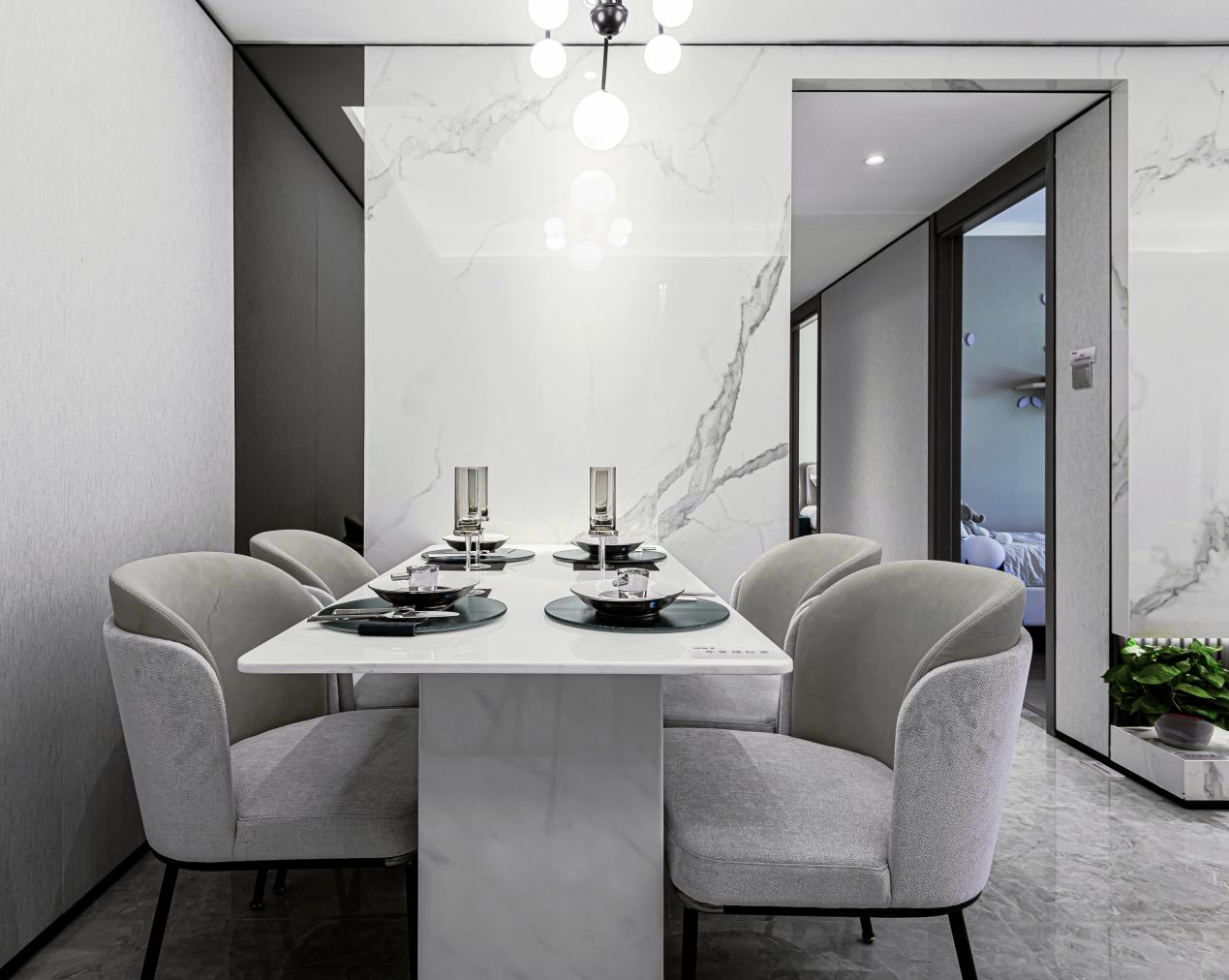 ▲餐厅以灰色餐椅组合大理石台面,点缀自然的蓝绿元素,在光线的调和下营造围桌而食的温馨氛围。