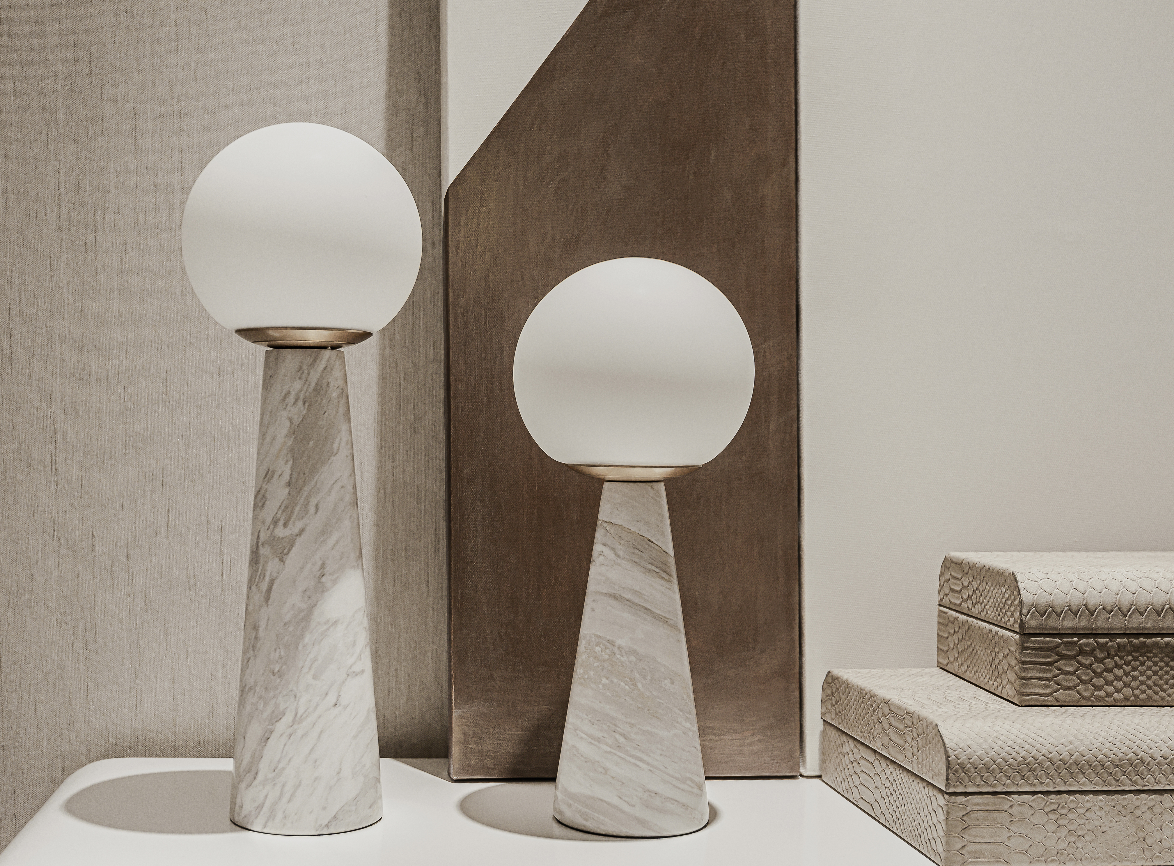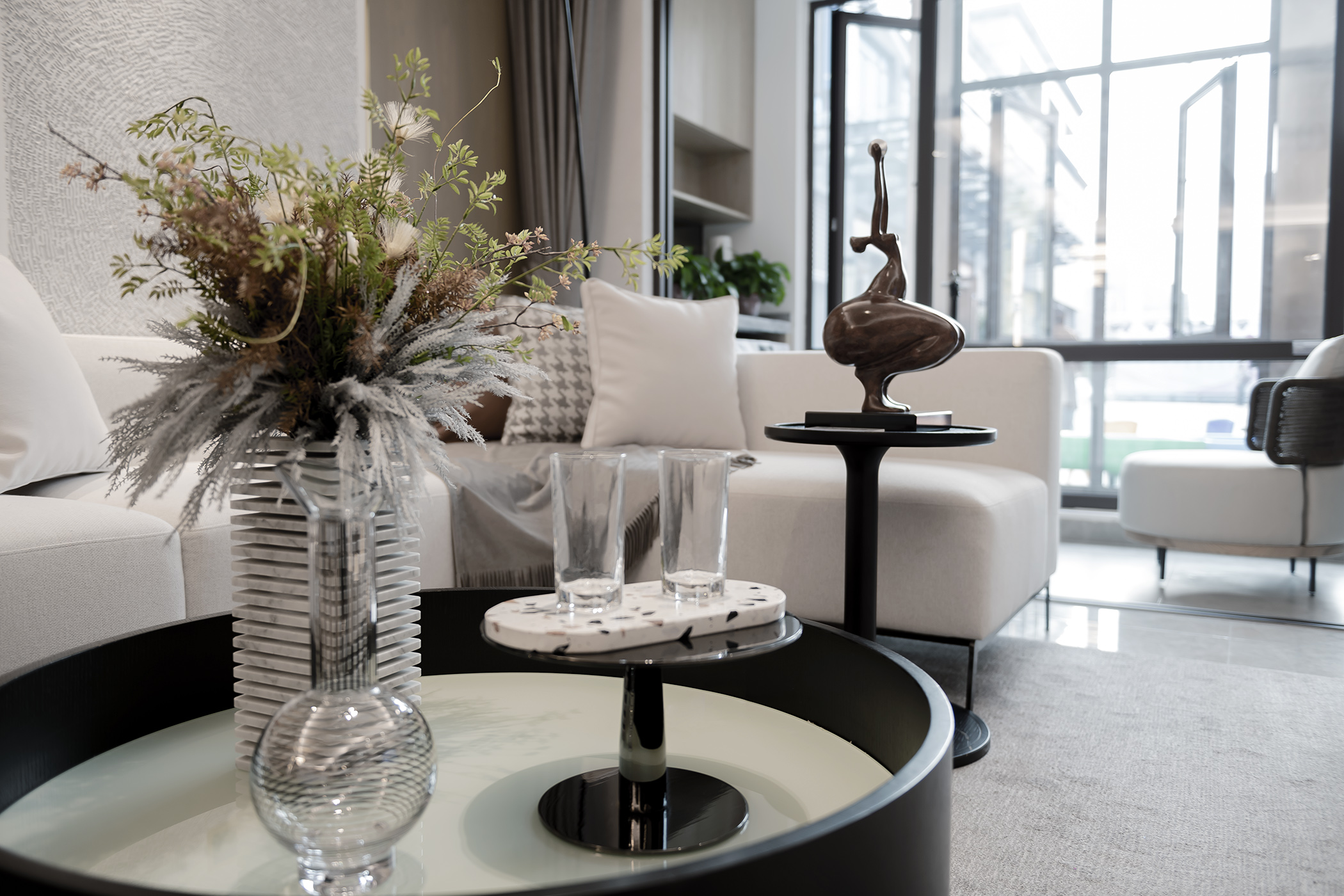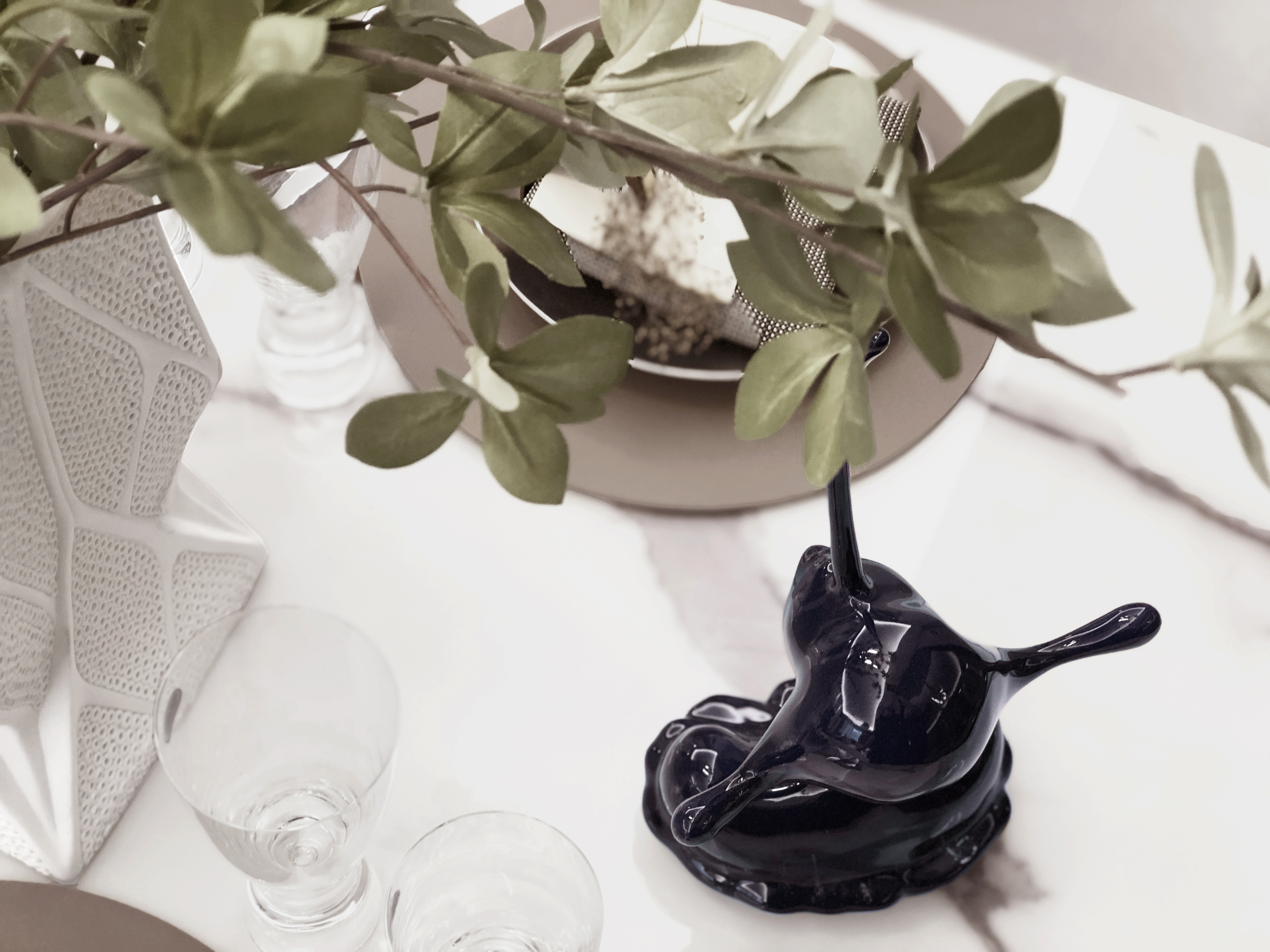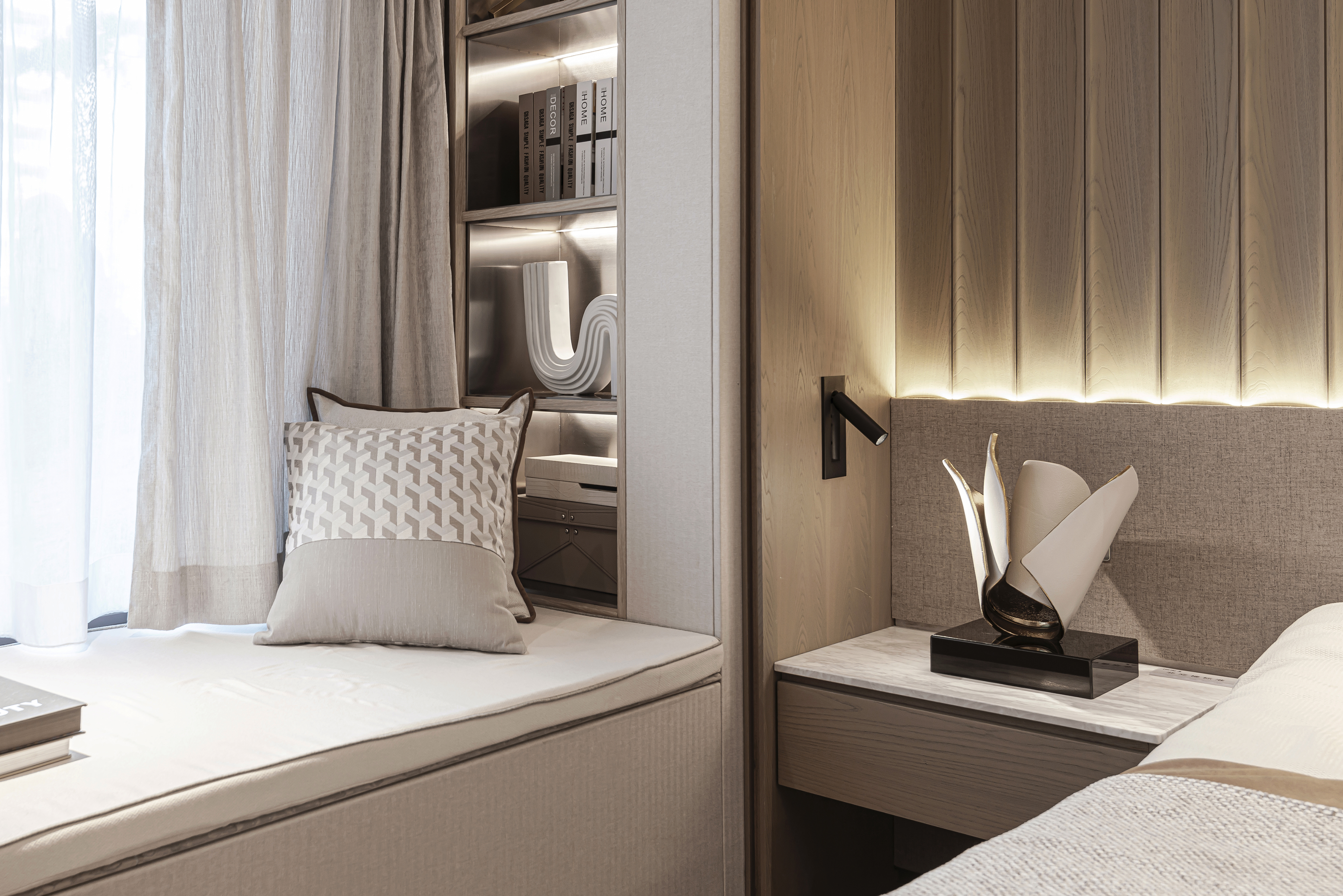 铅白、饴色、浅茶营造出色彩与空间之间的相生共构,从而形成空间的高级质感,桌上的器物以清冽感呈现它们自身独特的本质美——“摒弃花哨、物尽其用”。当光线映入室内,所见之处便是伸手可及的慵懒闲适,让人在场景中享受艺术自然的熏陶。