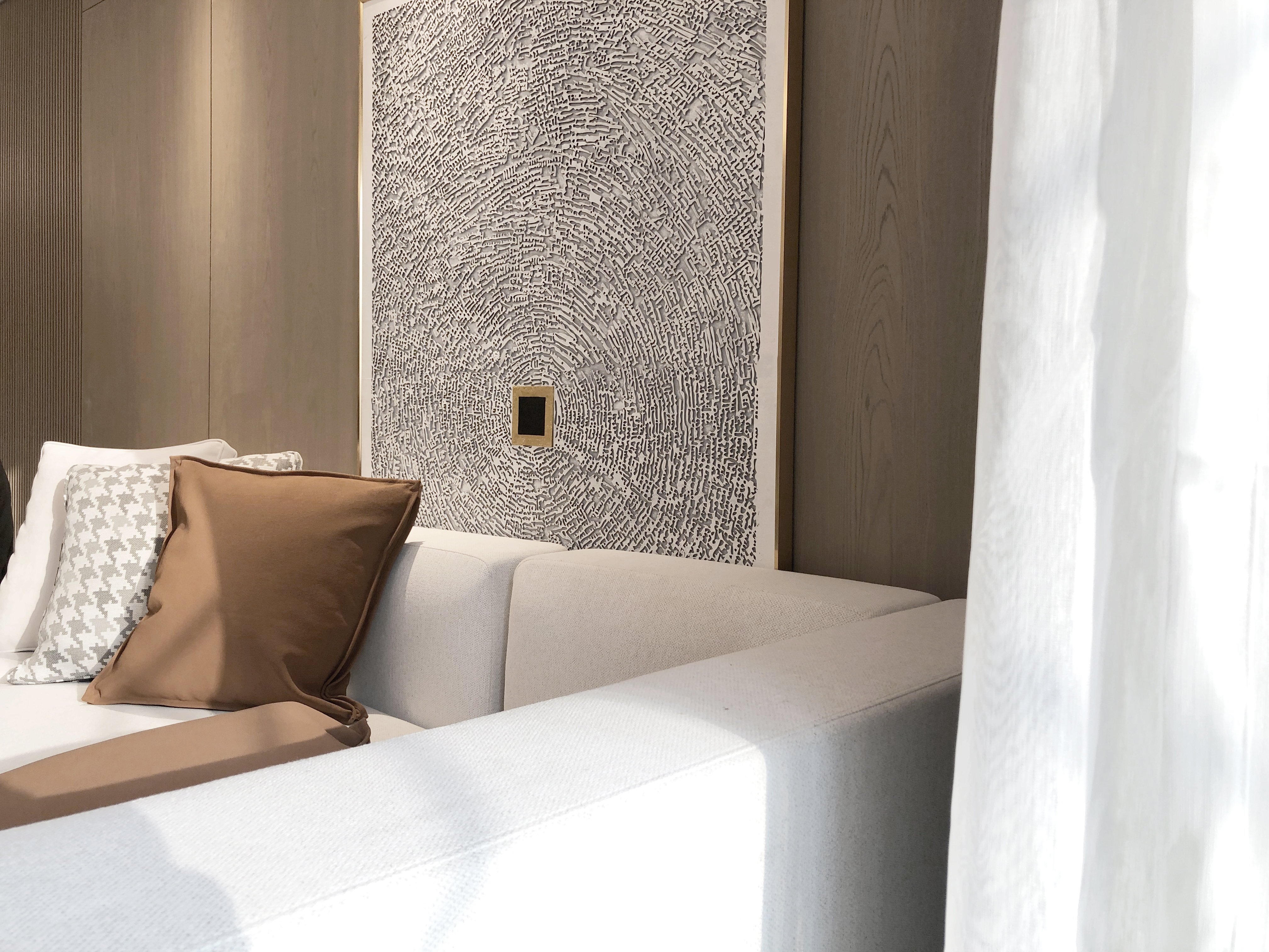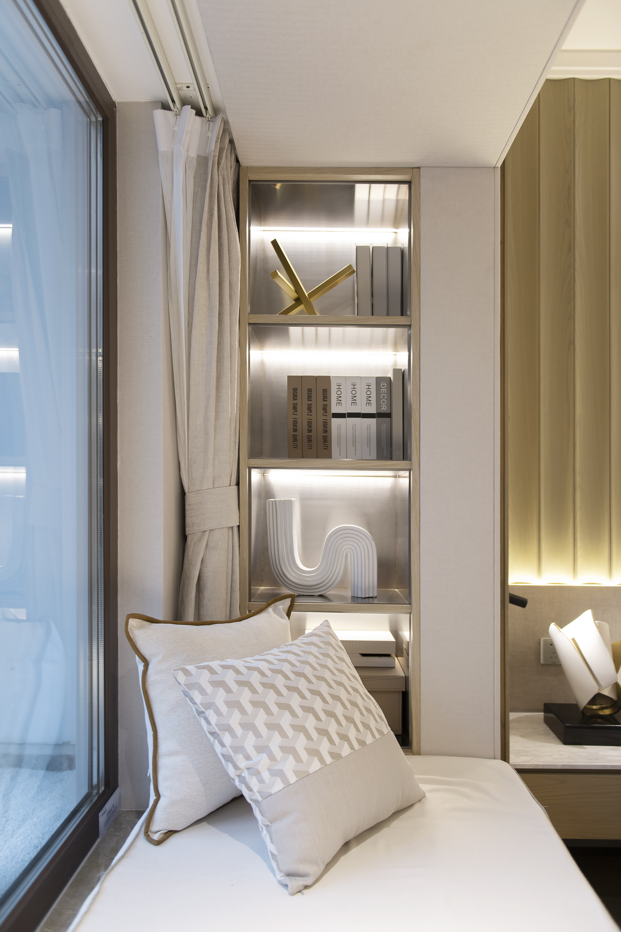 日光透过窗户轻盈入室,错综光影在黄铜的反射下,层层渐进与递减交织。一侧立地收纳柜,勾勒着空间的多重性能,可独自冥想、工作、阅读,随风而上,一室宁静细腻。