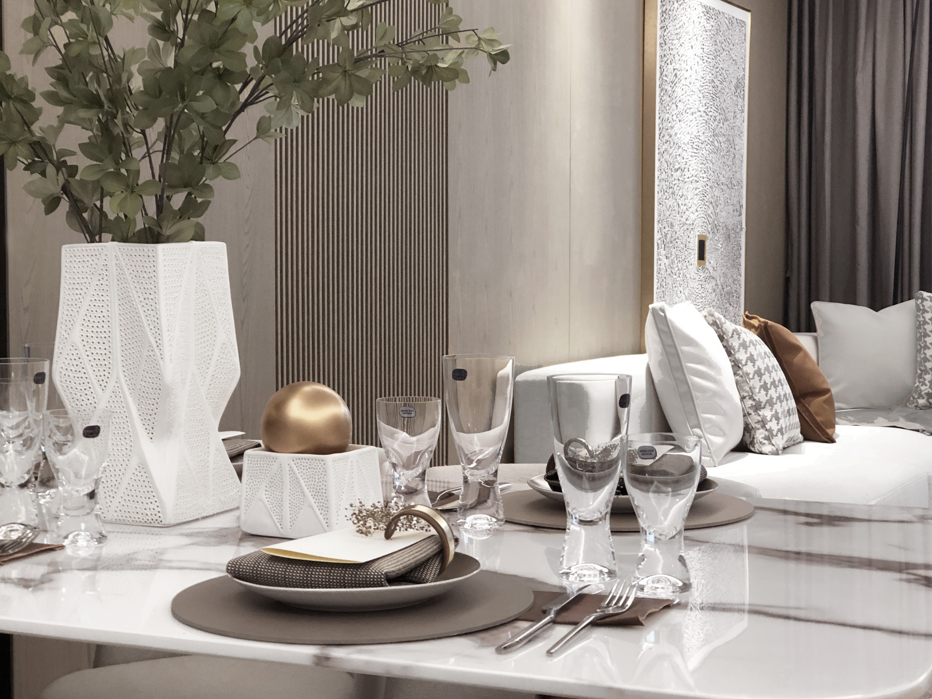 餐桌采用大理石与金属的结合,搭配精致的吊灯,让空间更具生活品质感。